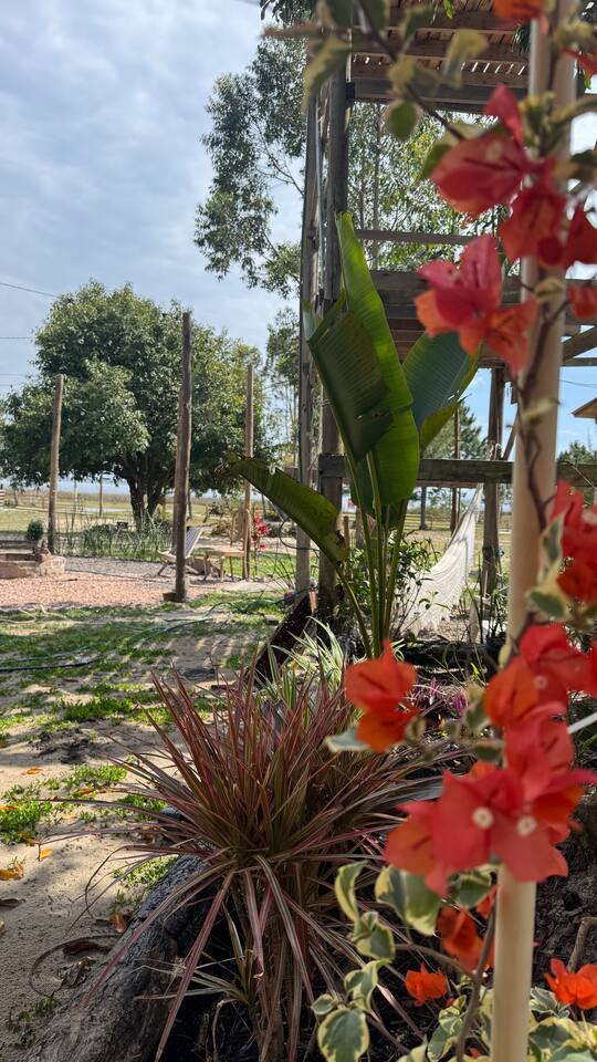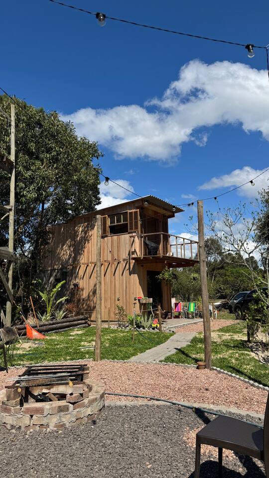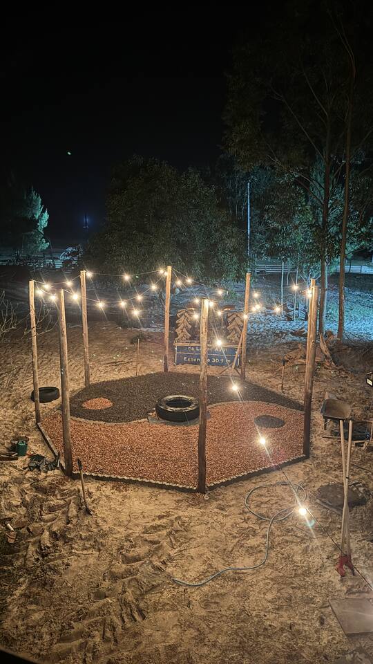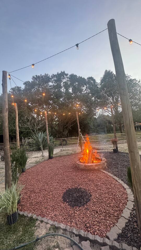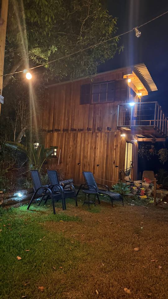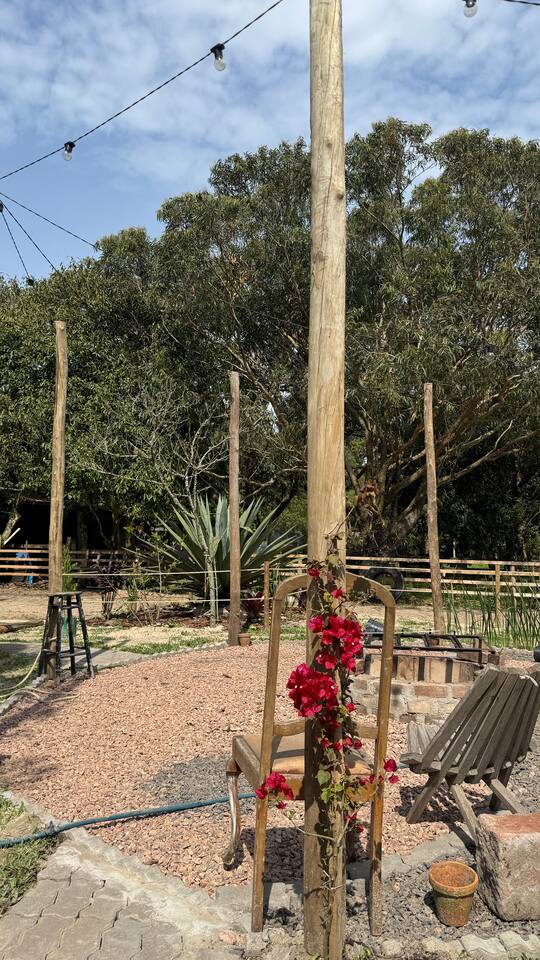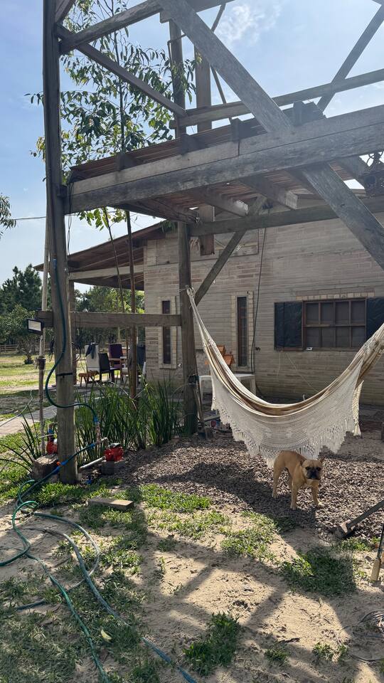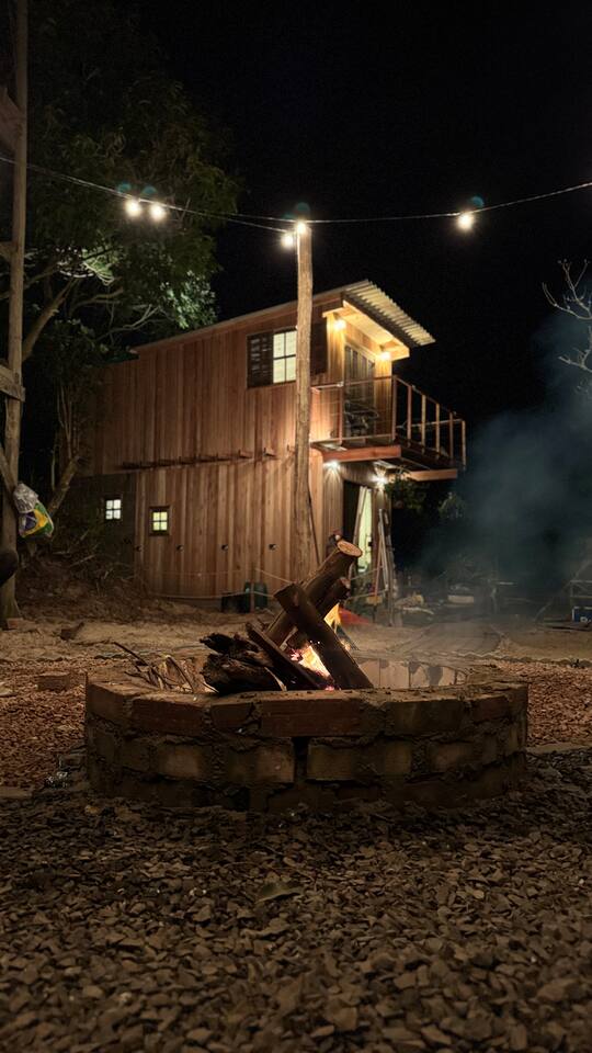 Na parte externa tem um pátio grande, com varal de luzes, lareira externa e suporte de rede . Churrasqueira portátil caso precise .