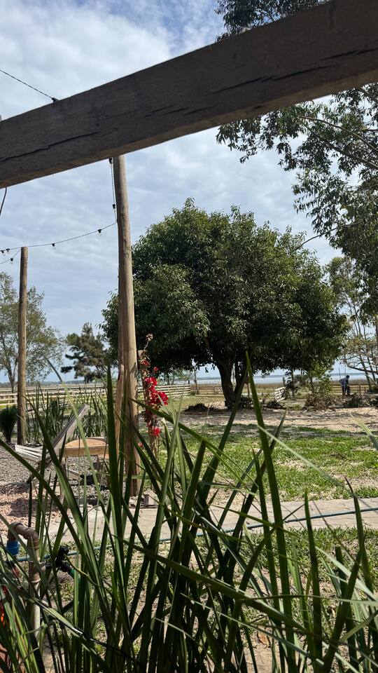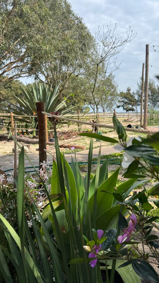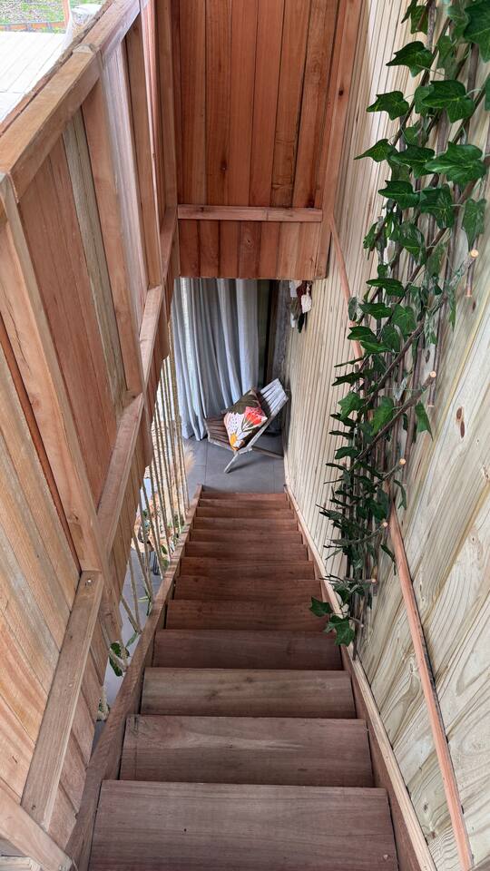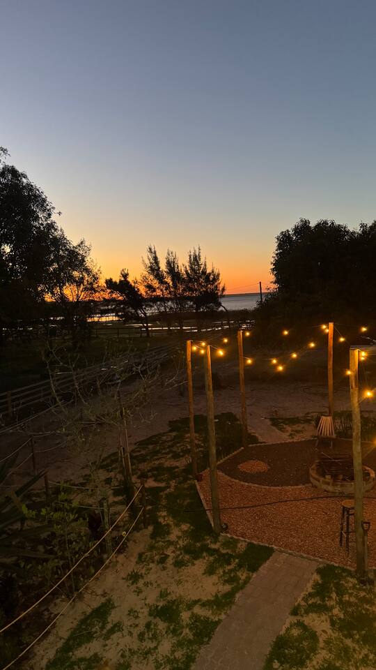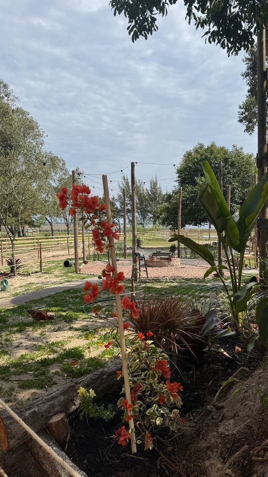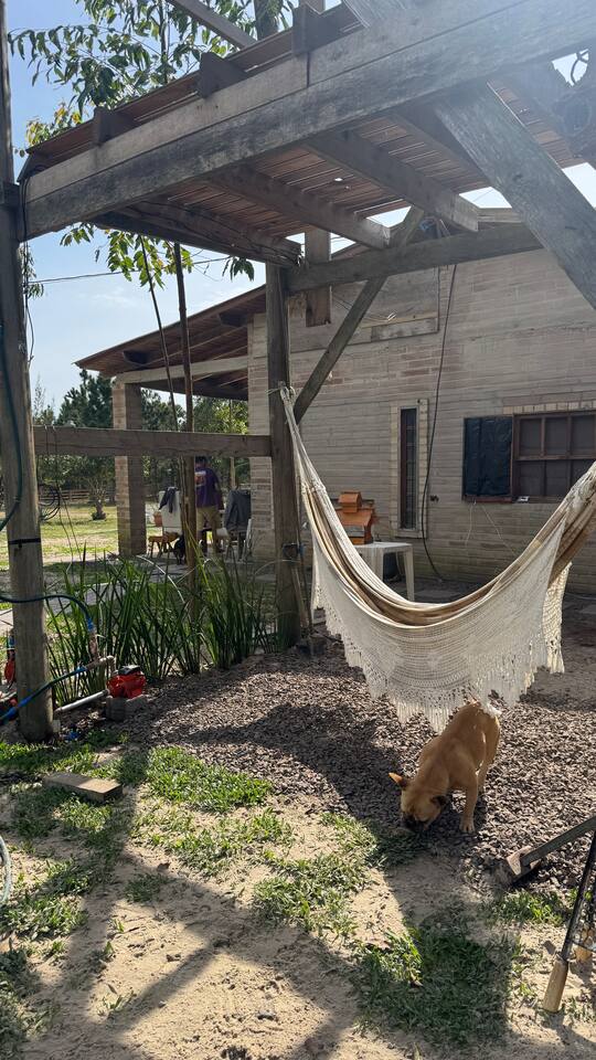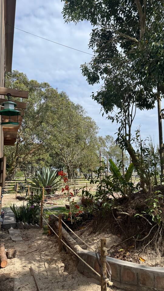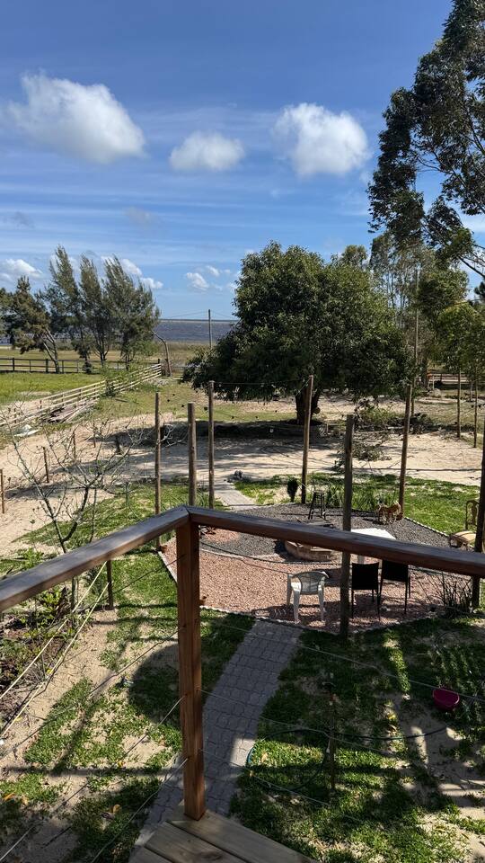 Na parte externa tem um pátio grande, com varal de luzes, lareira externa e suporte de rede . Churrasqueira portátil caso precise .