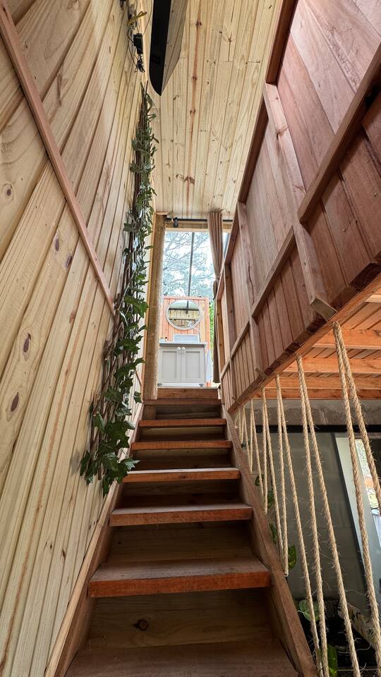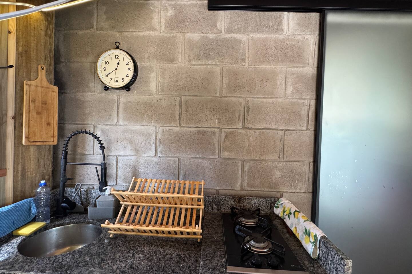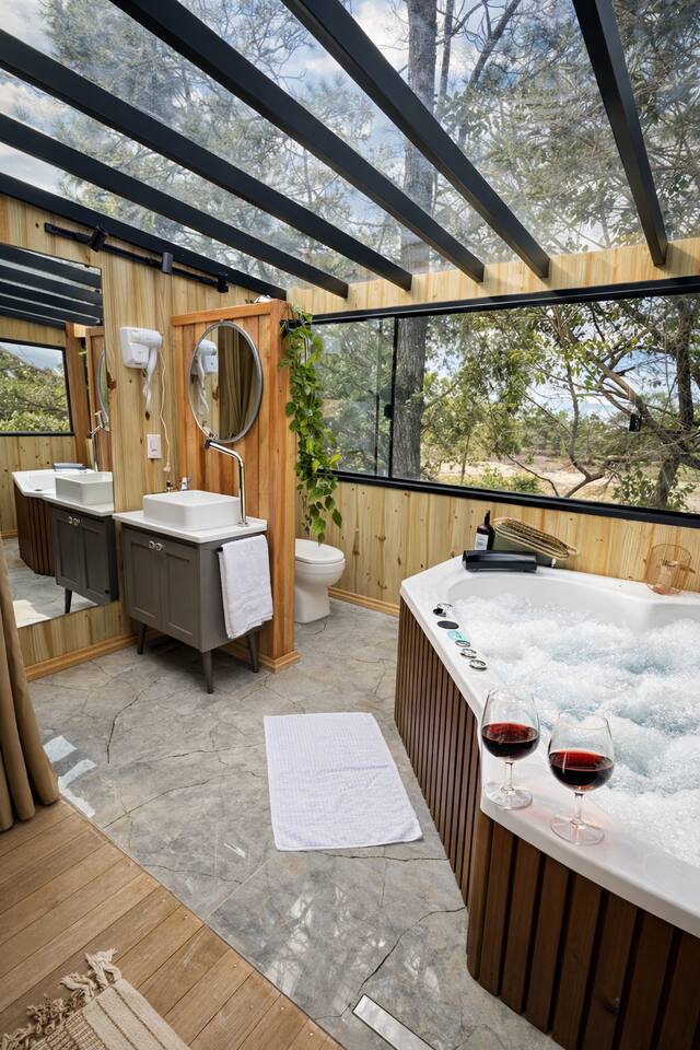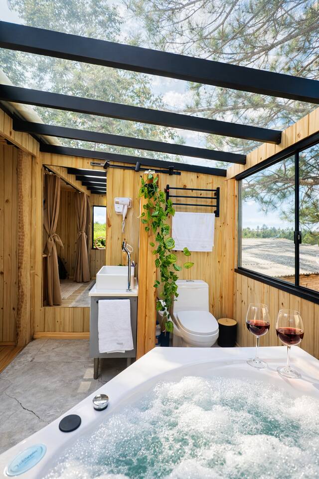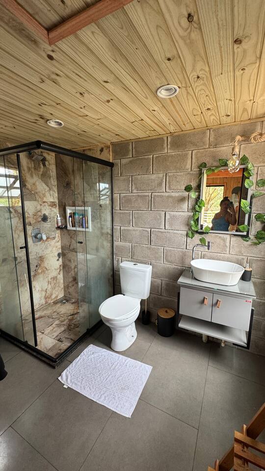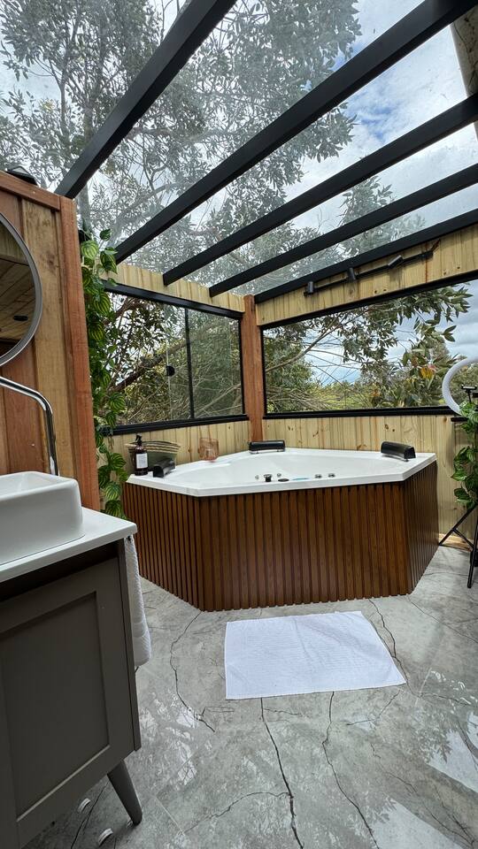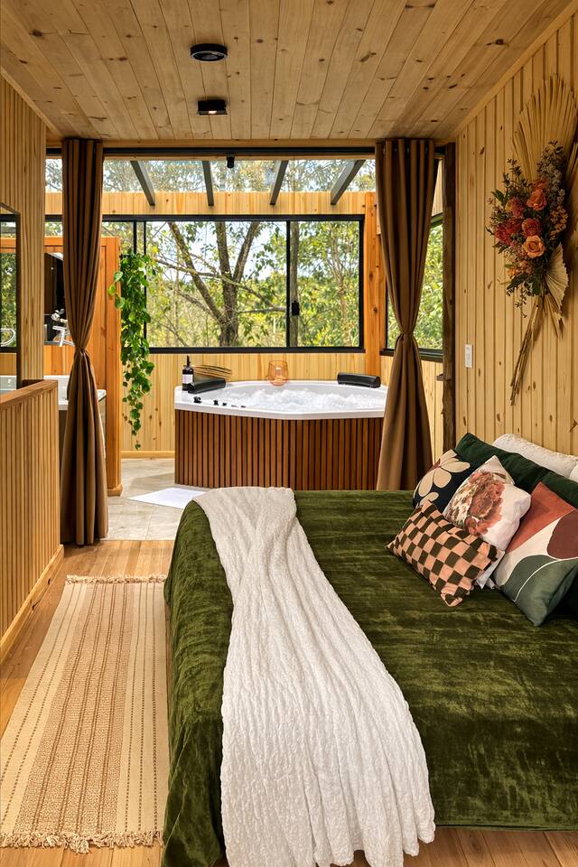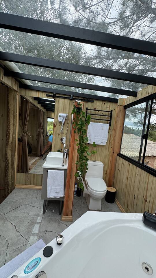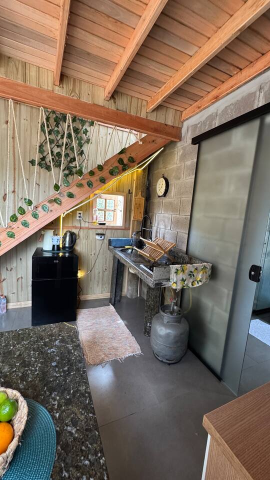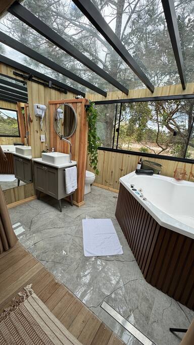 A cabana Éden tem dois piso, no primeiro sendo sala e cozinha conjugada, com sofá cama, frigobar com freezer, jarra elétrica , fogão duas bocas , e todos utensílios de sozinha básicos . Banheiro com chuveiro e aquecimento a gás, box de vidro , janela com vista para natureza. No segundo piso tem uma vista panorâmica toda em vidro , inclusive o teto acima da hidromassagem, vaso sanitário e gabinete de pia. Todas torneiras com aquecimento a gás. A cama é baixa dando um ar mais aconchegante , as cortinas são blackout, diminuindo a luz do quarto para seu conforto, tem uma mesinha com cadeira para trabalho e porta para sacada .