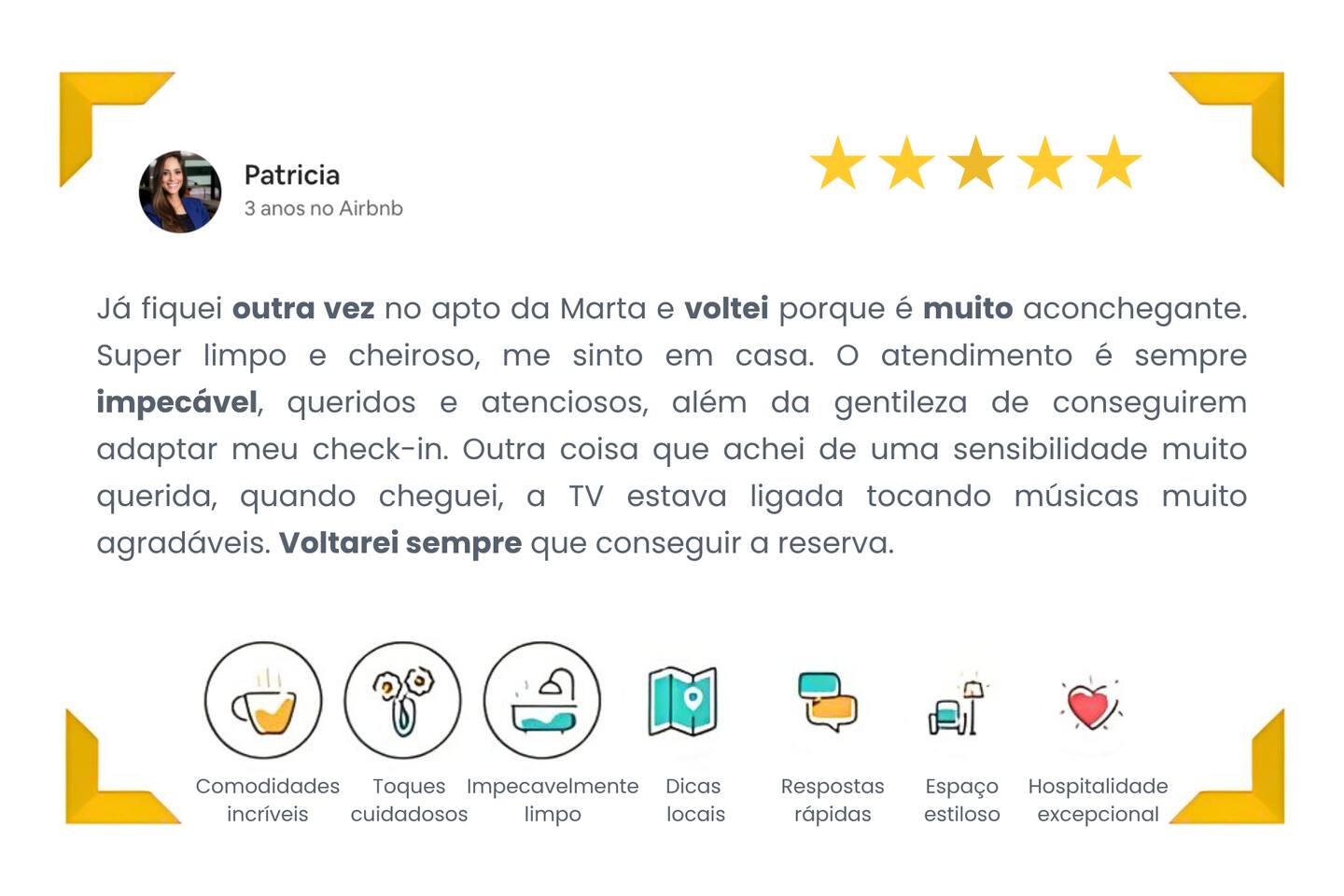 O apartamento é incrível. Tudo impecável. Tem um garden muito legal para tomar café da manhã. Marta foi muito prestativa e cordial.