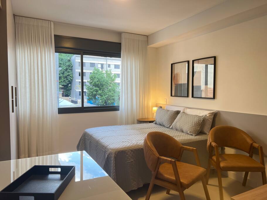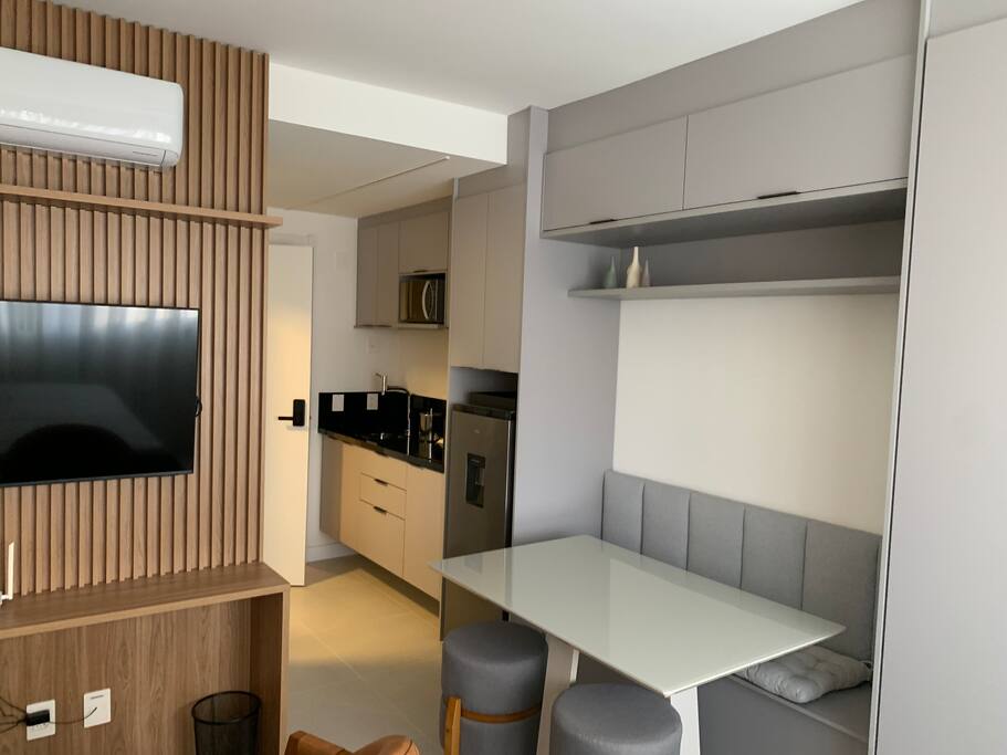 🛋️ Sala Smart TV 50'' Ar-condicionado Wi-Fi 2 poltronas confortáveis Mesa de jantar com 2 puffs 🍳 Cozinha Geladeira, fogão por indução e micro-ondas Chaleira elétrica Panelas, frigideiras e leiteira Pratos, taças, copos e xícaras Talheres e utensílios completos para cozinhar 🛏️ Quarto Cama de casal com roupa de cama completa Abajur e mesa de cabeceira Roupeiro com cabides Cortinas e decoração aconchegante 🛁 Banheiro Secador de cabelo Suporte para toalha e papel higiênico Lixeira 🧼 Outros itens úteis Ferro de passar roupa Itens de limpeza (vassoura, rodo, pá, balde) Escorredor de louça, tábua de corte e jogo americano