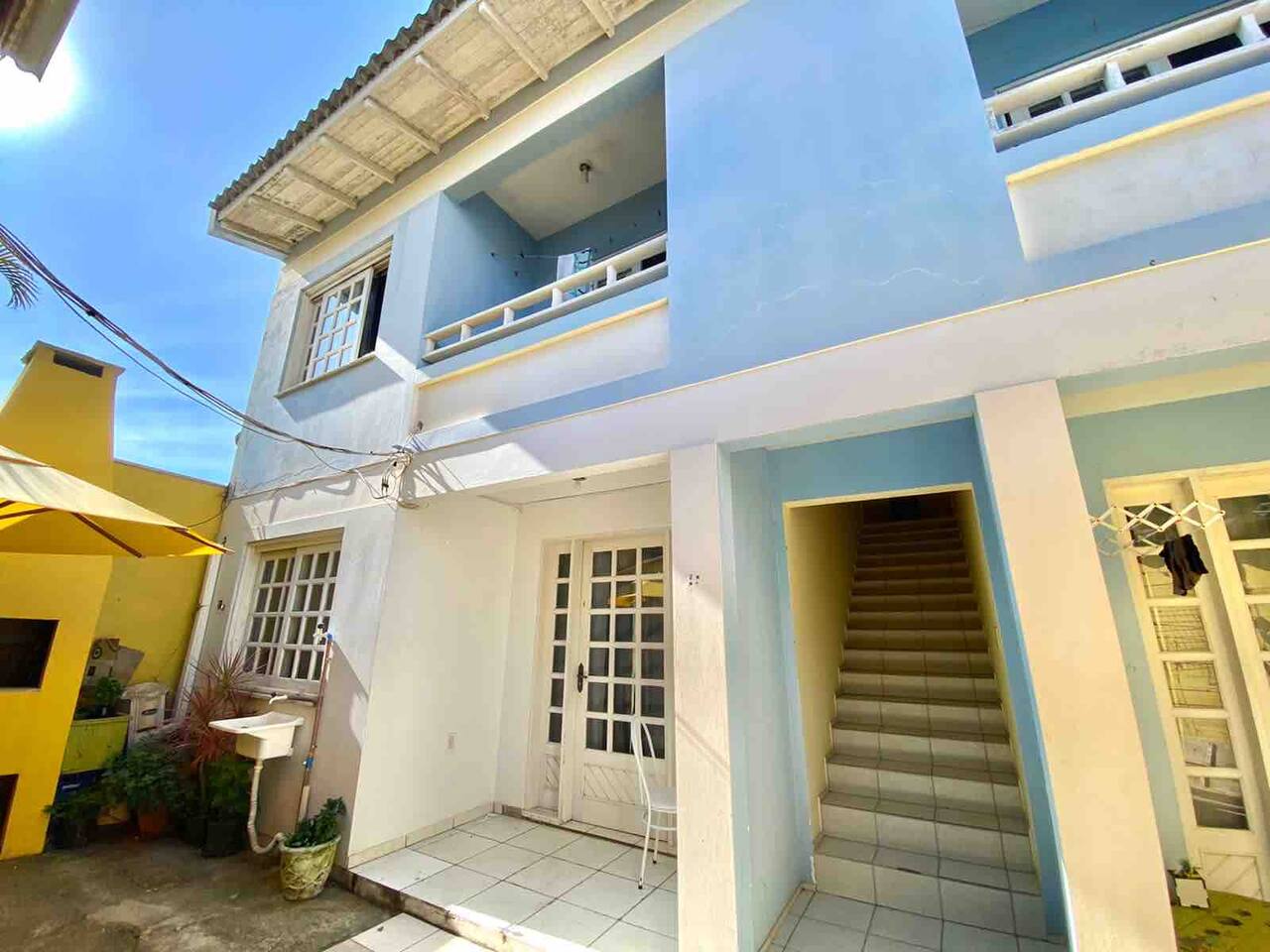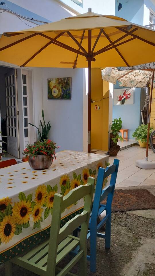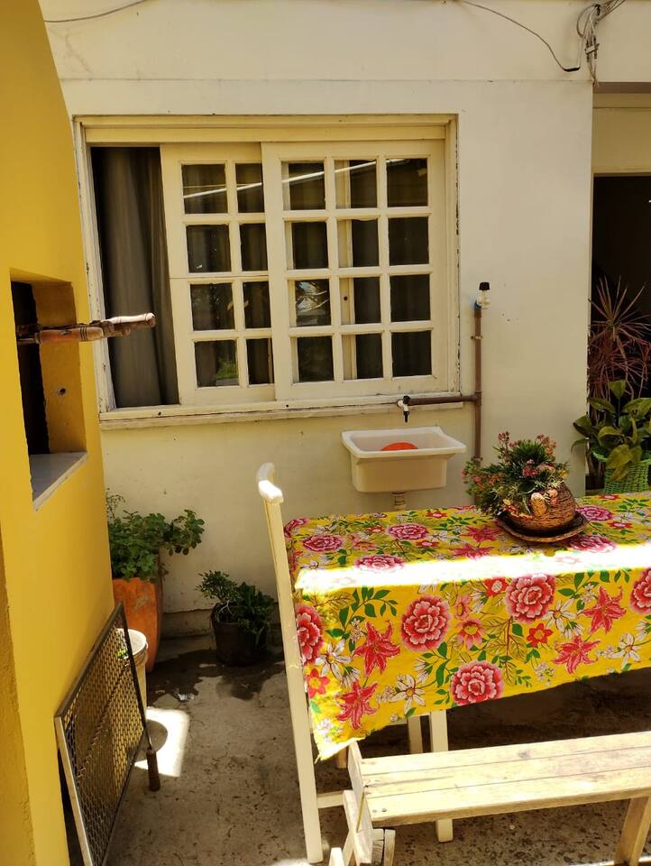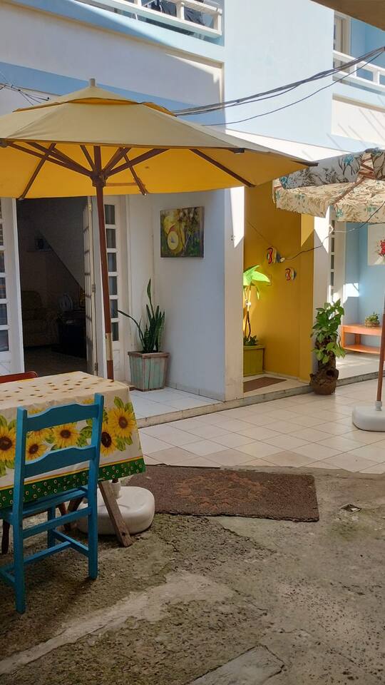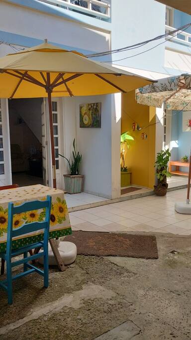 Apartamento 1 e área do apartamento com a churrasqueira no pátio.