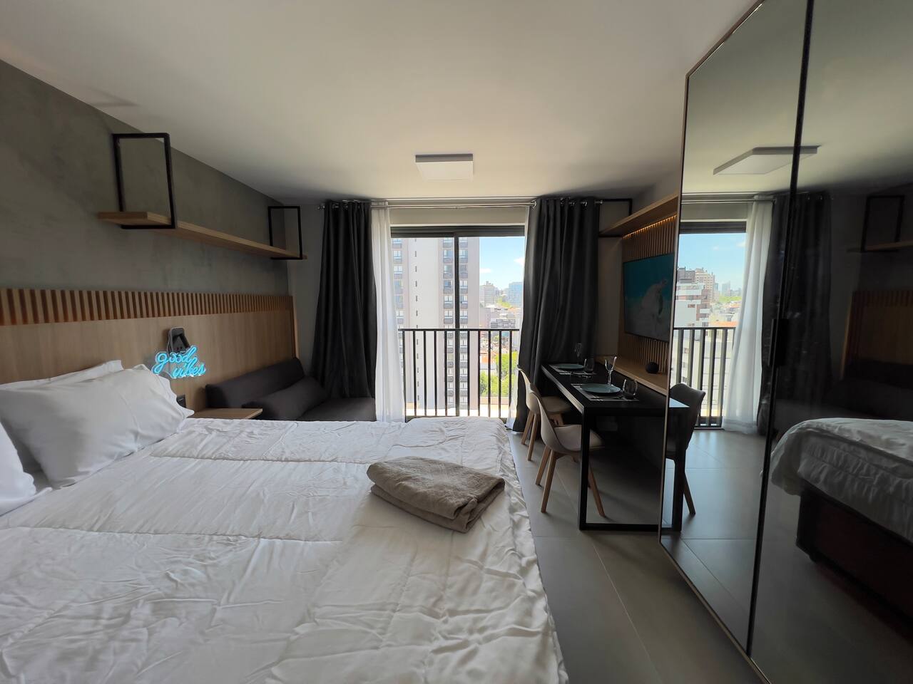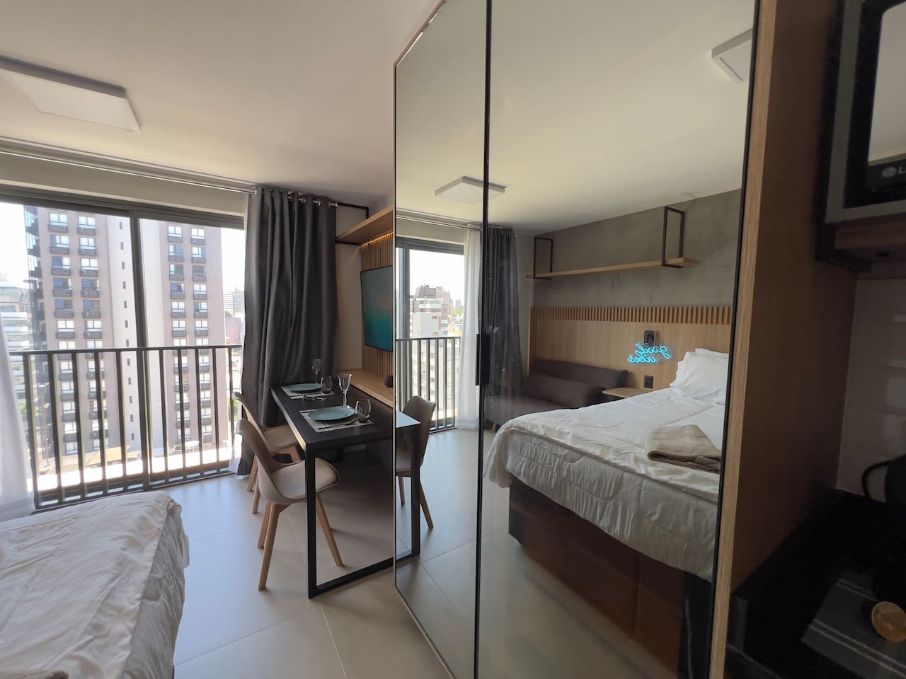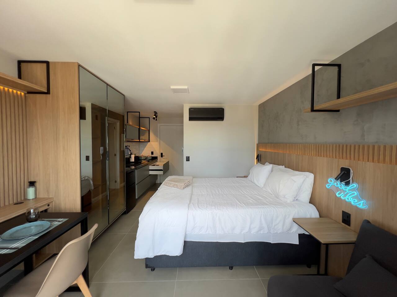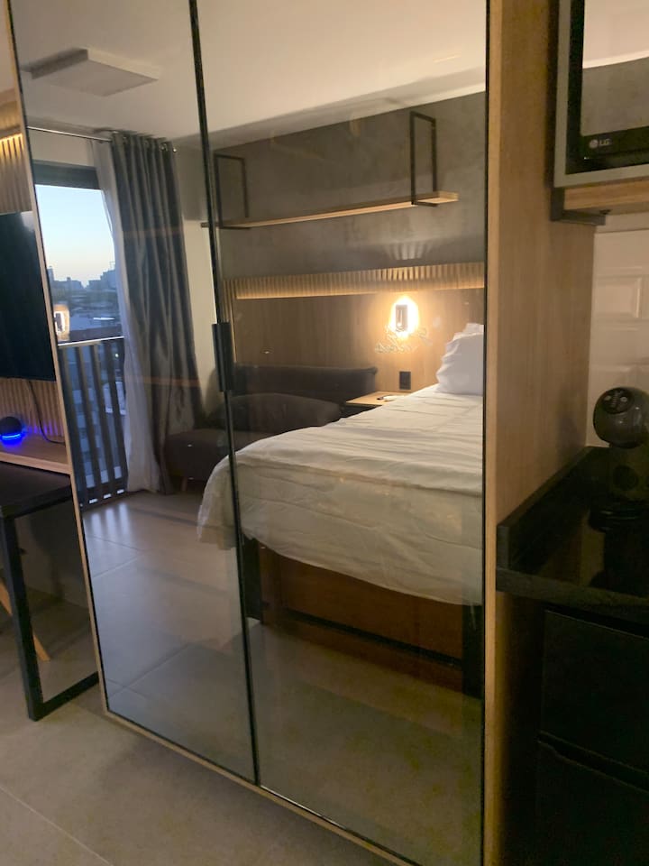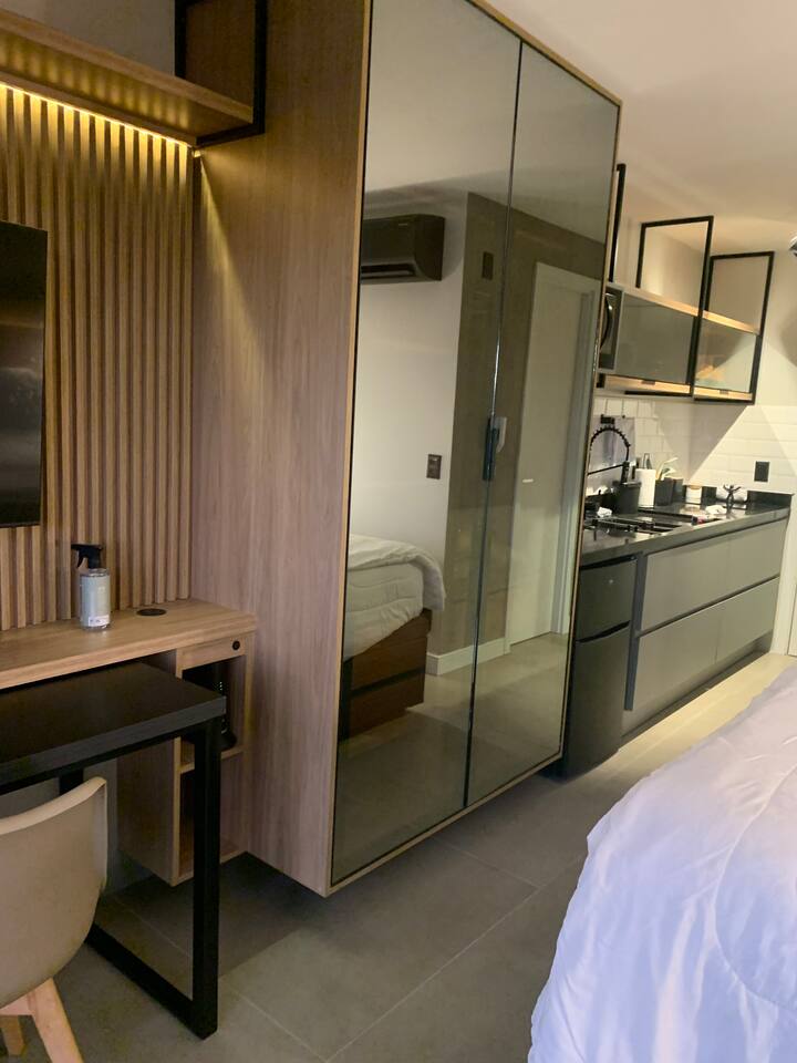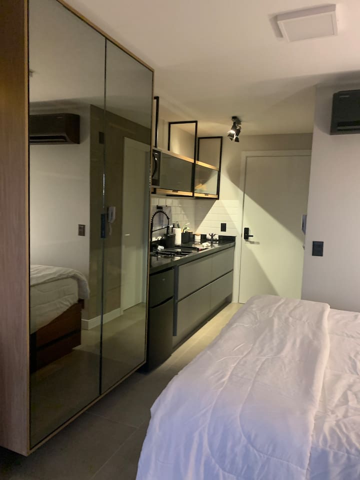 O espaço é realmente igual nas fotos. Tudo muito limpo, cheiroso e de muito bom gosto. Os espaços comuns são lindíssimos, ótima infraestrutura, piscina térmica e uma vista incrível para a cidade. Mercadinho muito prático que atendeu muito bem as necessidades. Conforto e segurança. Bairro ótimo, vários bares e restaurantes próximos. O Lucas foi um ótimo anfitrião, nos respondeu com agilidade sempre cordial e simpático. Adoramos! Recomendo!