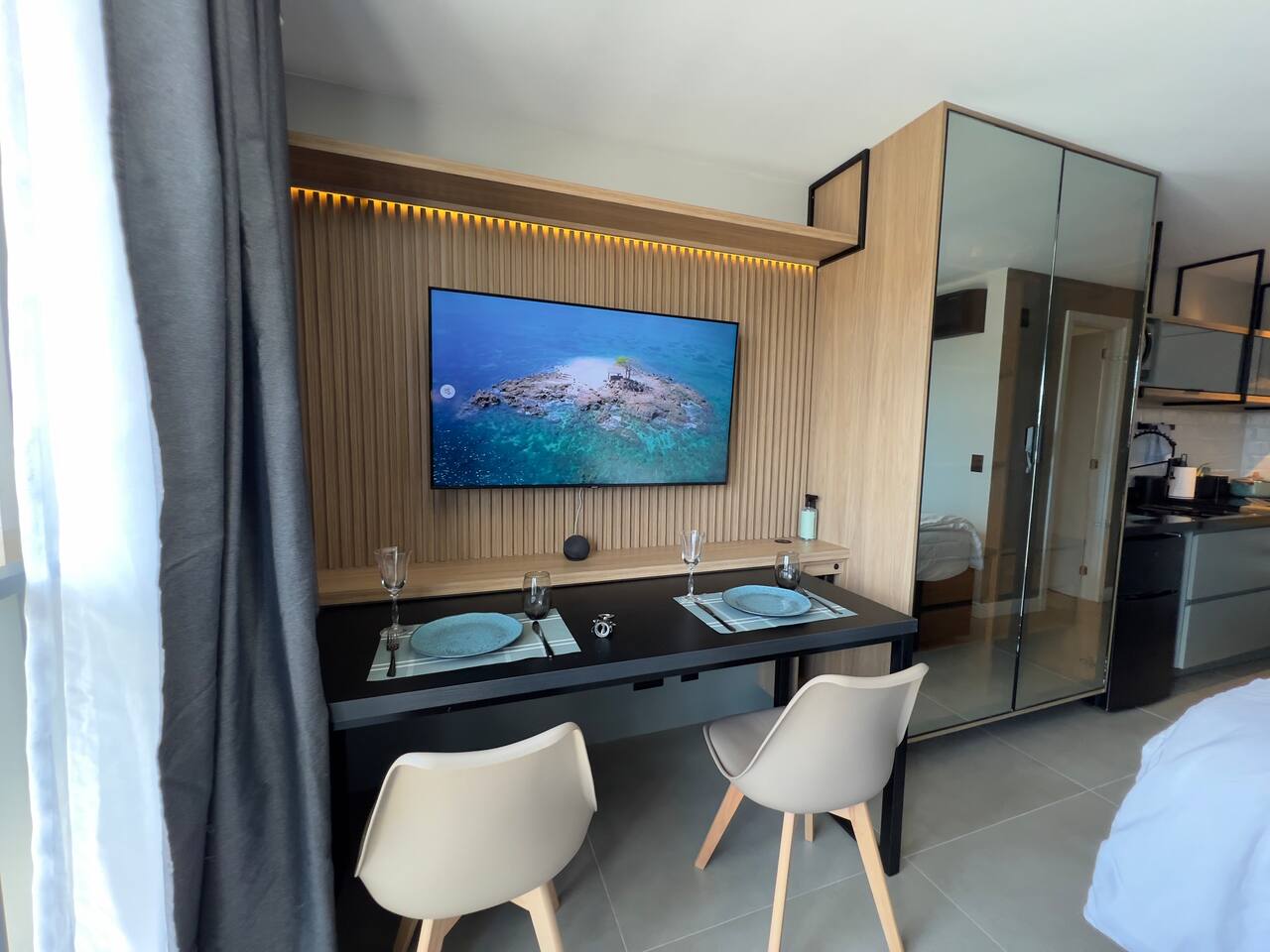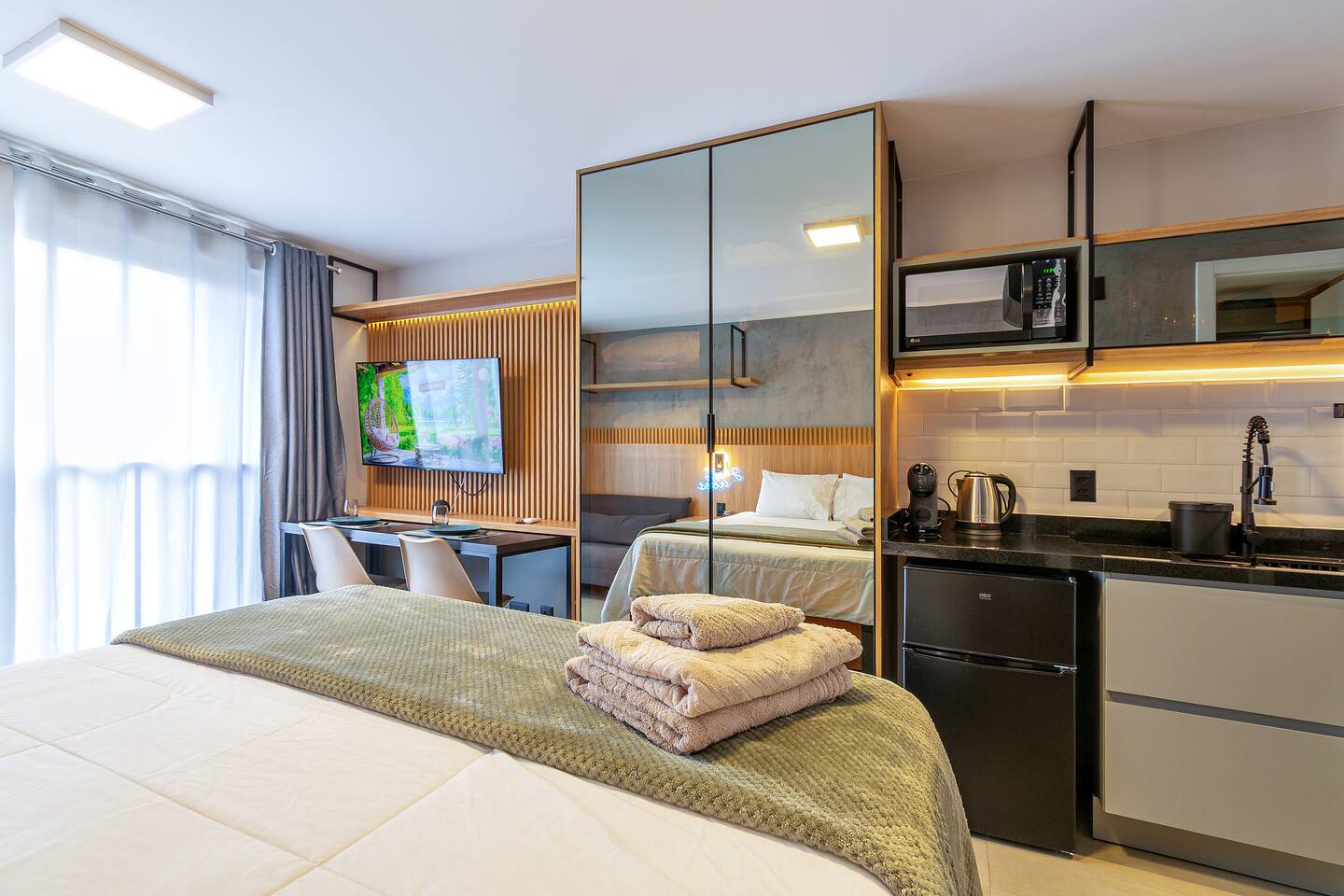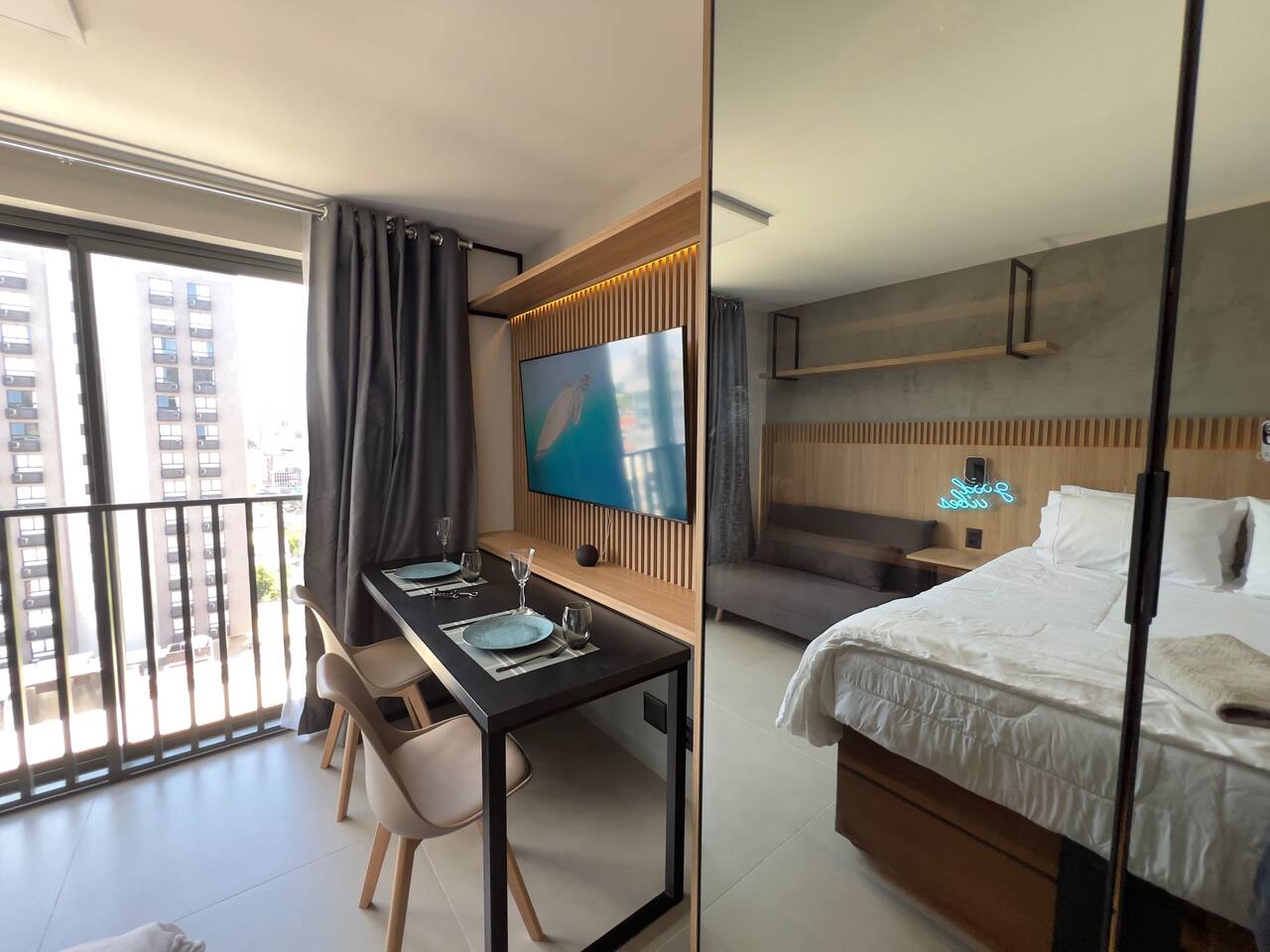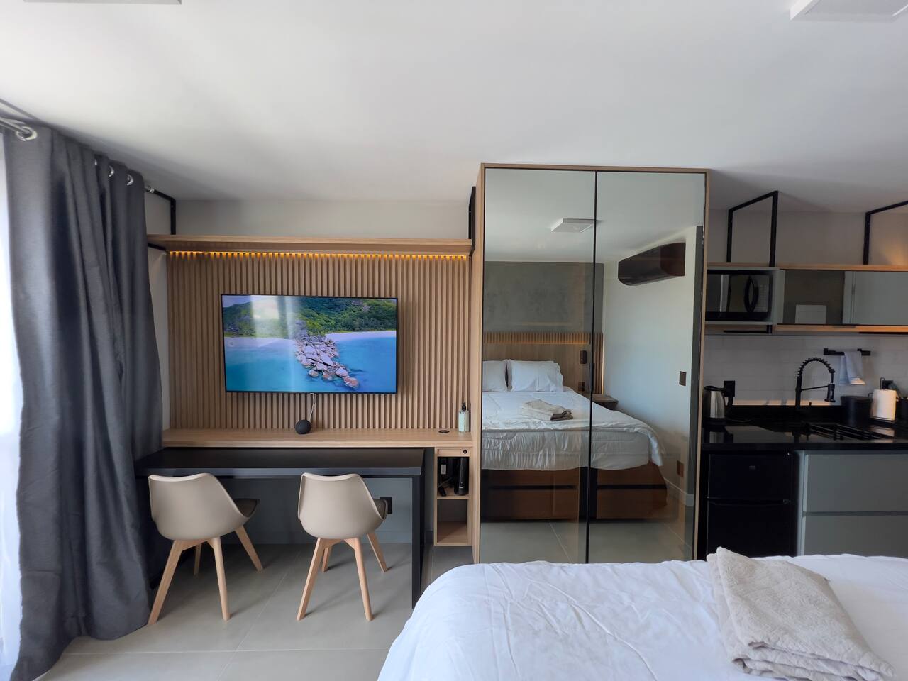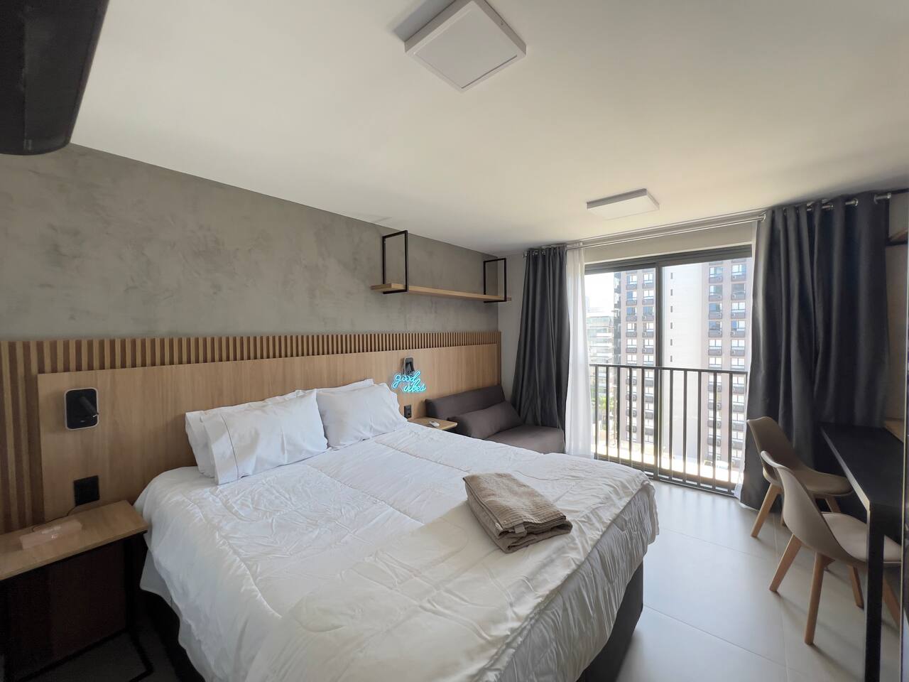 O espaço é realmente igual nas fotos. Tudo muito limpo, cheiroso e de muito bom gosto. Os espaços comuns são lindíssimos, ótima infraestrutura, piscina térmica e uma vista incrível para a cidade. Mercadinho muito prático que atendeu muito bem as necessidades. Conforto e segurança. Bairro ótimo, vários bares e restaurantes próximos. O Lucas foi um ótimo anfitrião, nos respondeu com agilidade sempre cordial e simpático. Adoramos! Recomendo!