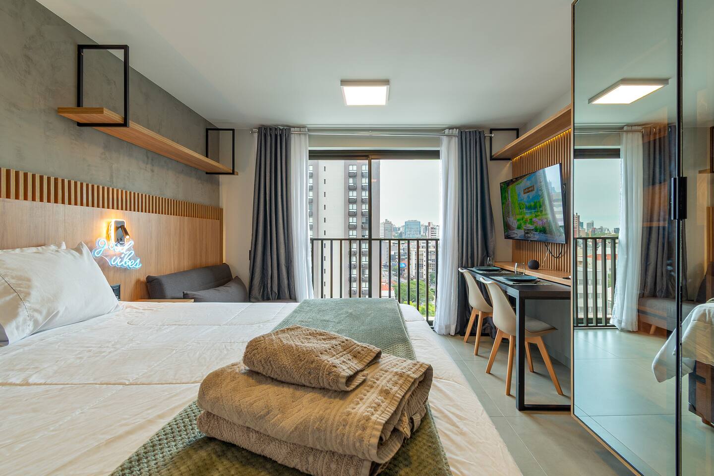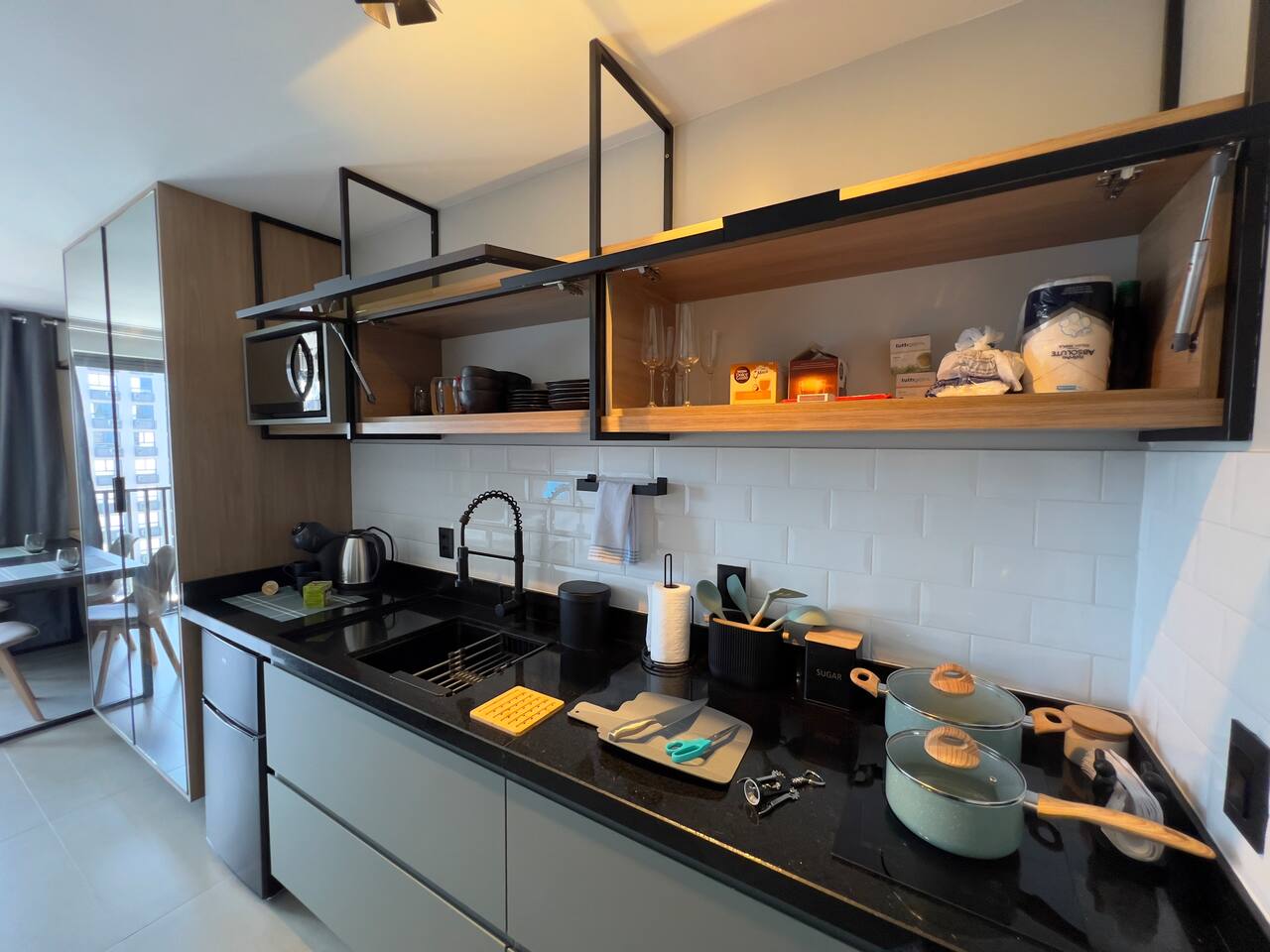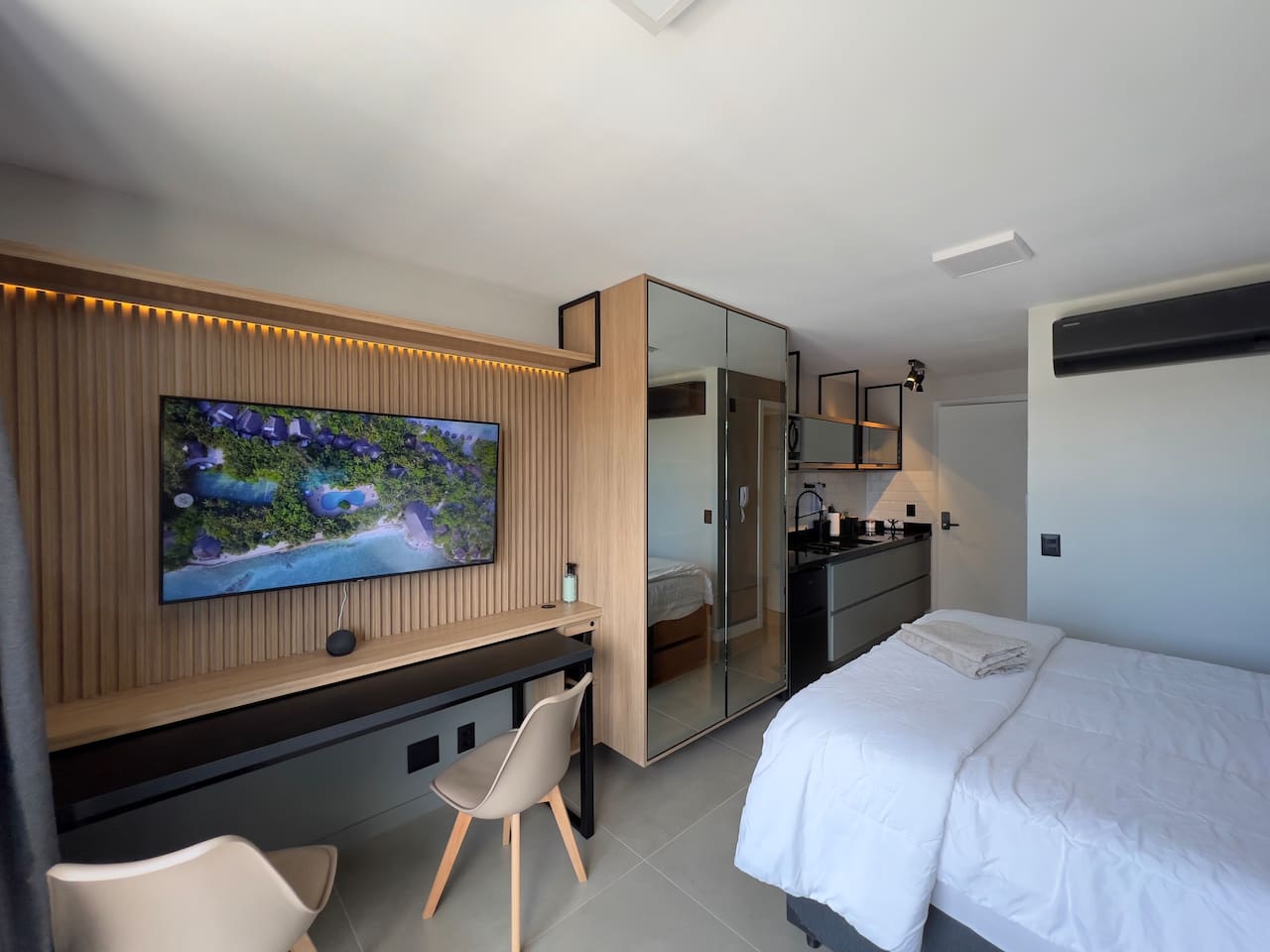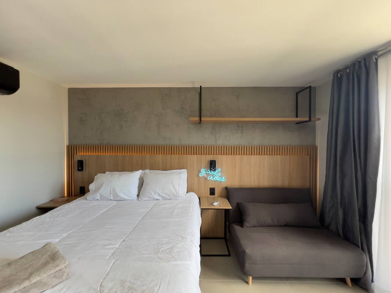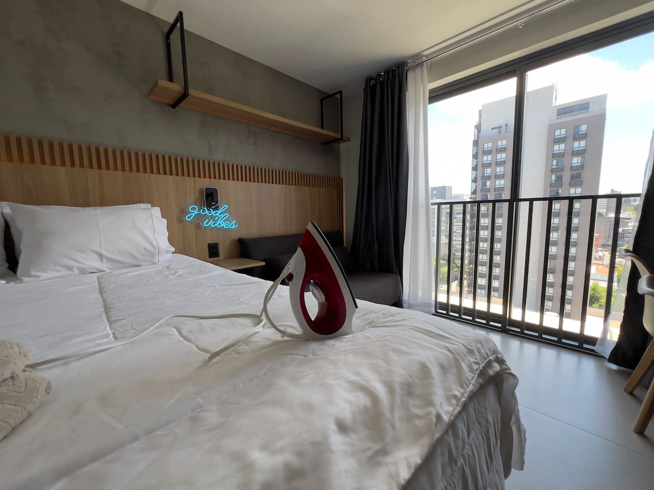 O espaço é realmente igual nas fotos. Tudo muito limpo, cheiroso e de muito bom gosto. Os espaços comuns são lindíssimos, ótima infraestrutura, piscina térmica e uma vista incrível para a cidade. Mercadinho muito prático que atendeu muito bem as necessidades. Conforto e segurança. Bairro ótimo, vários bares e restaurantes próximos. O Lucas foi um ótimo anfitrião, nos respondeu com agilidade sempre cordial e simpático. Adoramos! Recomendo!