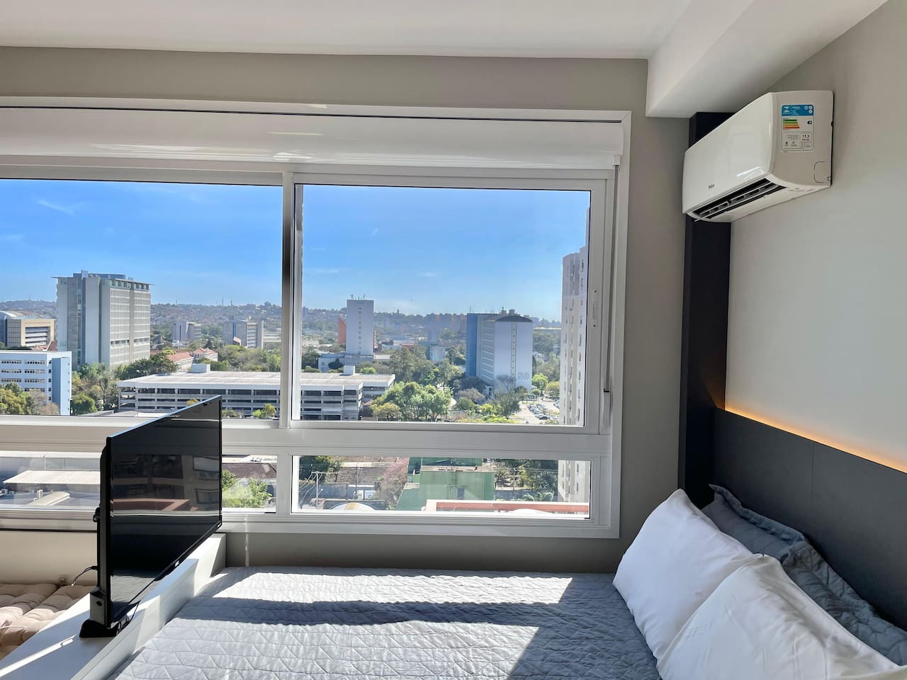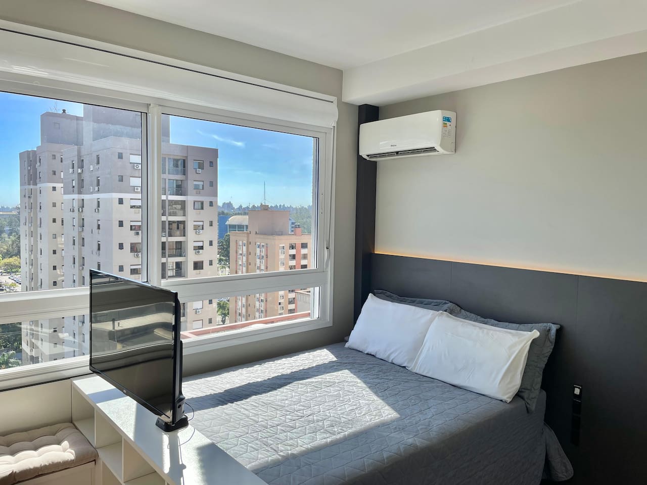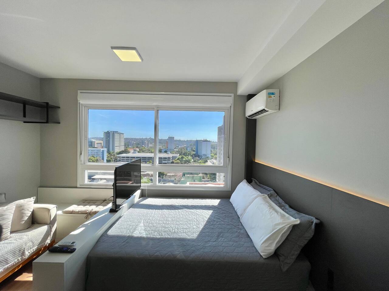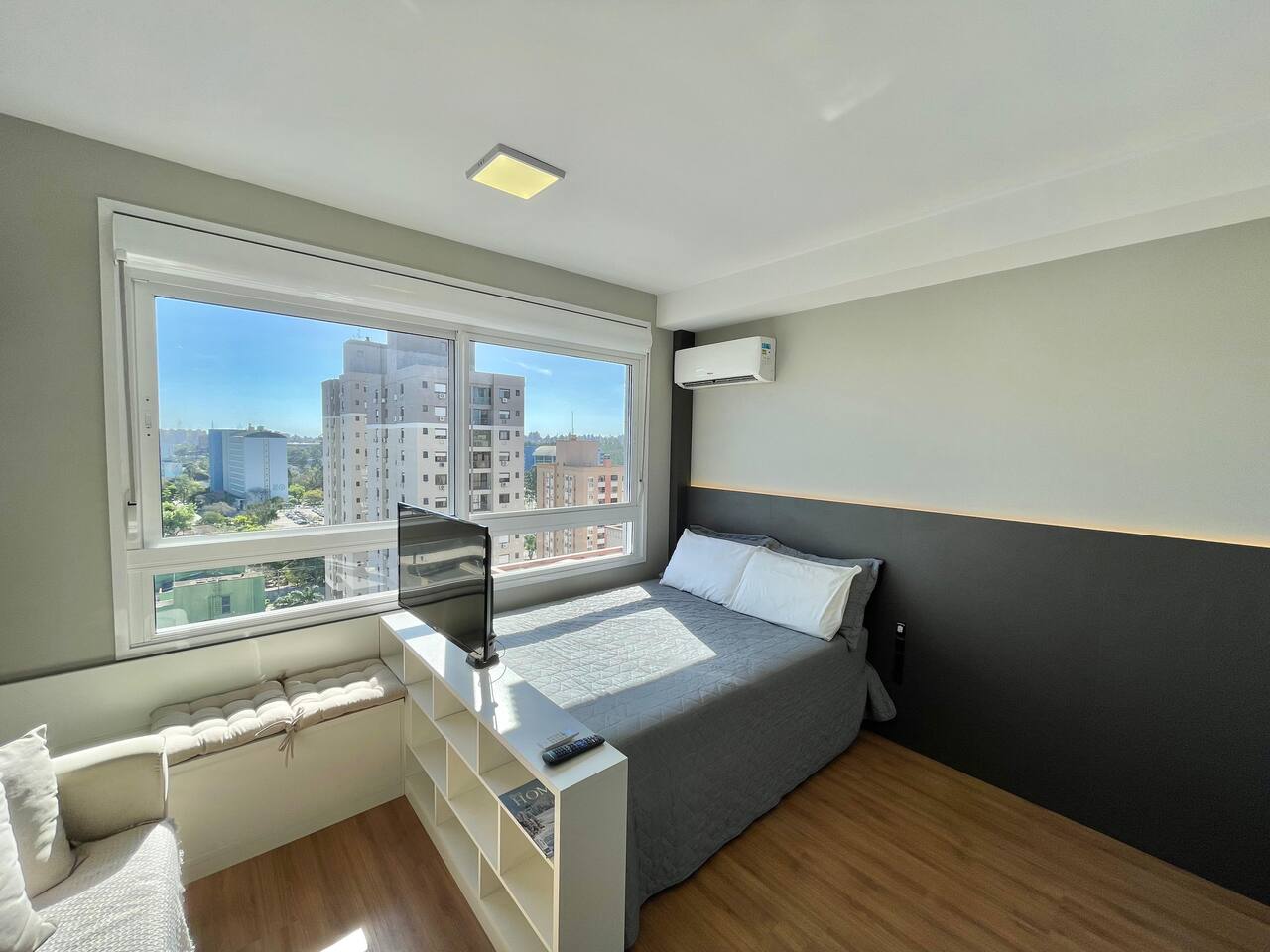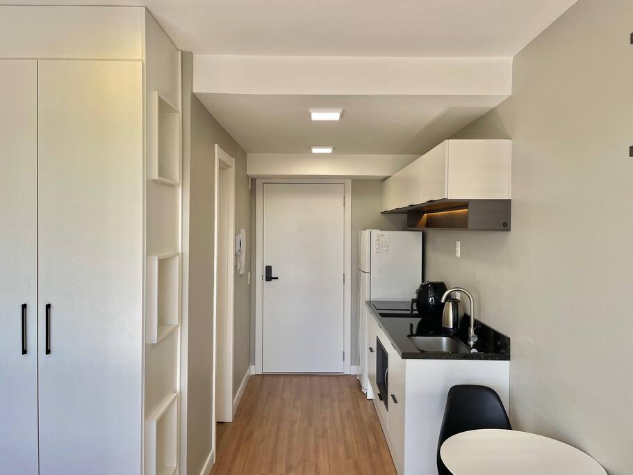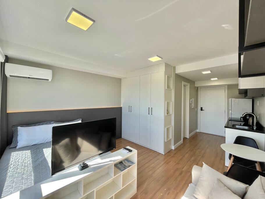 ✨ Você terá o conforto do 16º andar neste Loft com SmartTV, Ar-Split e Cozinha equipada, Chuveiro a gás e Vaga de garagem gratuita incluída! Aqui você encontra: • Rooftop com vista panorâmica • Churrasqueiras • Piscina de 25m • Academia • Espaço Coworking • Portaria 24h • Lavanderia • Elevador, Garagem Proximidades: • Supermercados • Aeroporto ⟶ 25 min (carro) • PUC⟶ 4 min (a pé) • Centro, Consulado⟶ 15 min (carro)
