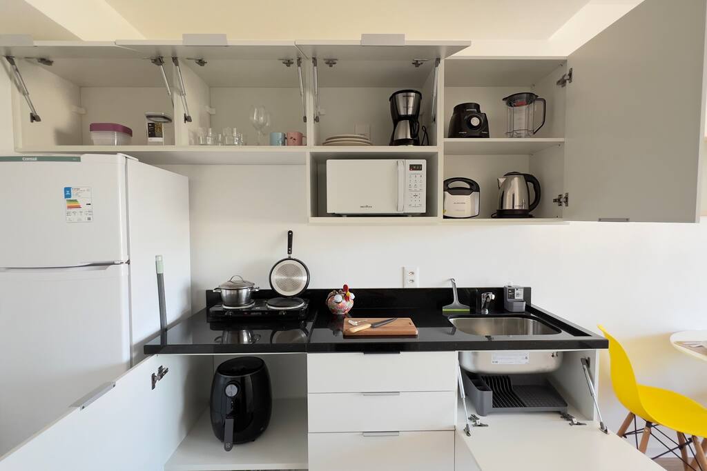 👨🏻🍳 Temos uma cozinha completa com todos utensílios, microondas, fogão de indução, panelas, Airfryer, talheres e pratos para sua estadia! A cama é muito confortável, a SmartTV tem todos os canais de assinatura! (Netflix, Amazon, Disney+, YouTube) Estacionamento gratuito e interno. Lavanderia mediante reserva e pagamento. Churrasqueiras no terraço com possibilidade de reserva!
