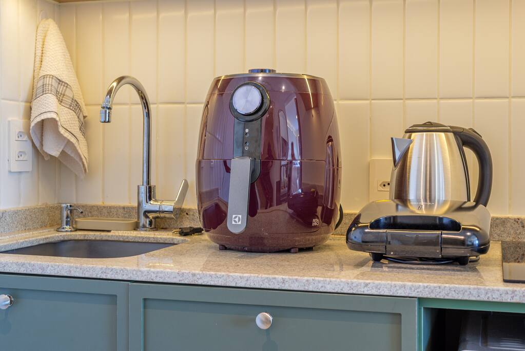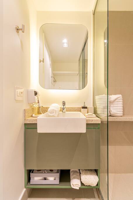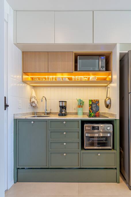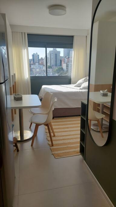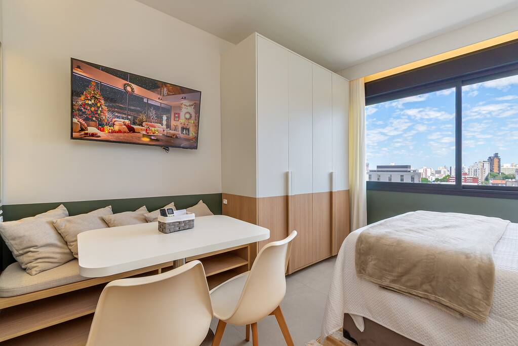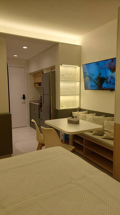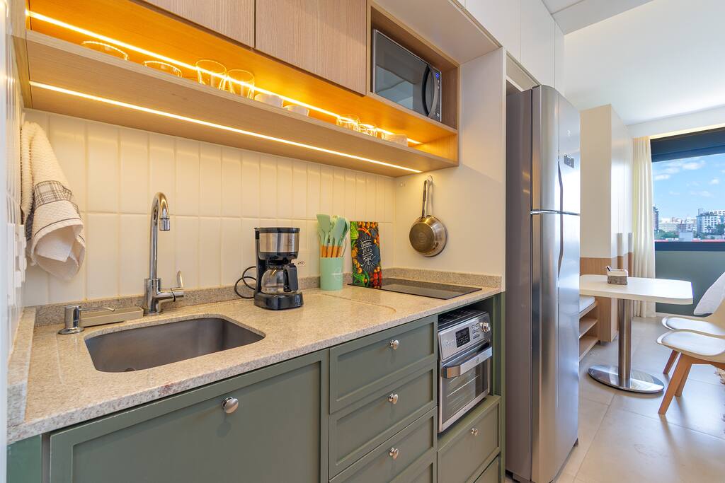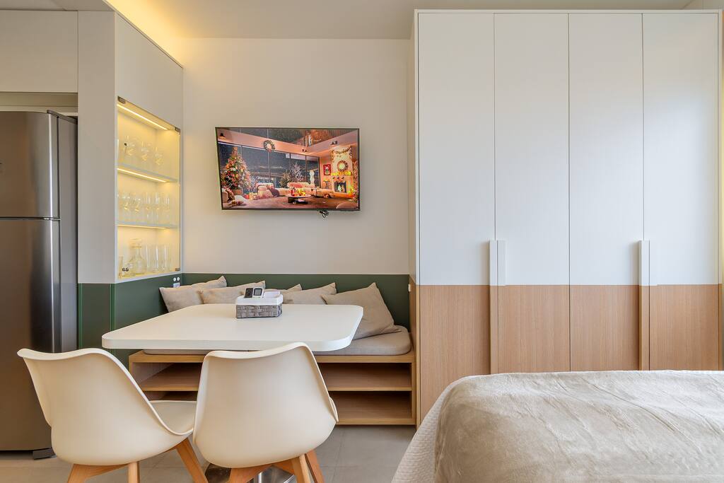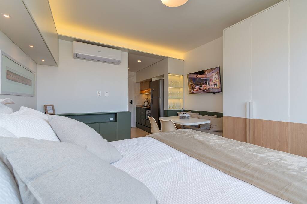 🍳 Cozinha Completa e prática, equipada com airfryer, micro-ondas, forno, cafeteira, chaleira elétrica, torradeira, geladeira, além de louças, talheres e utensílios de cozinha para preparar qualquer refeição com facilidade. 🛏️ Sala/Quarto (Studio Integrado) Ambiente confortável com cama queen e roupa de cama macia, mesa para refeições ou trabalho, smart TV, Wi-Fi rápido e ar-condicionado, garantindo bem-estar em todos os momentos. 🚿 Banheiro Oferece toalhas, um secador de cabelo e um espaço limpo e funcional para sua rotina diária.