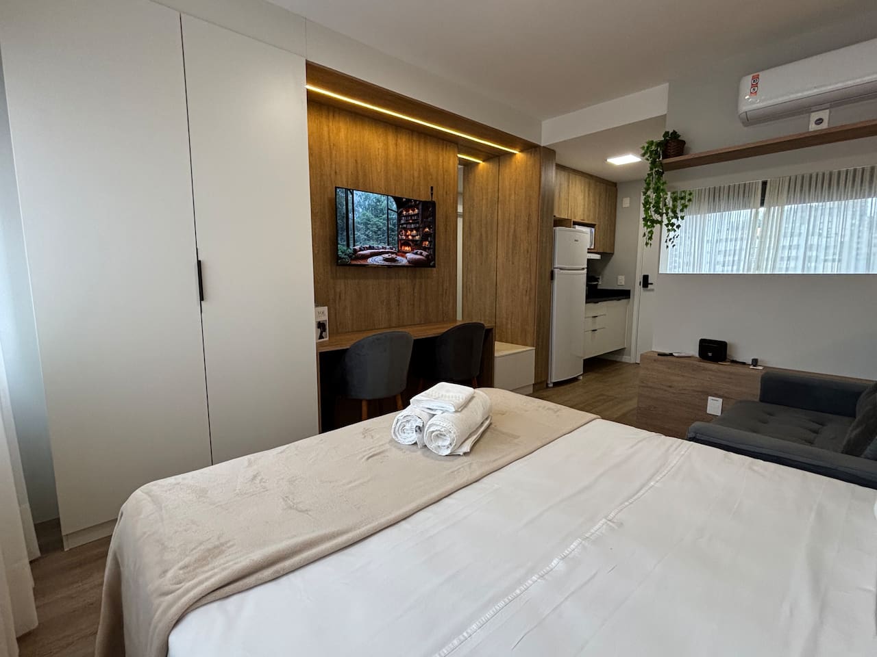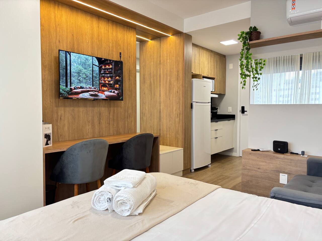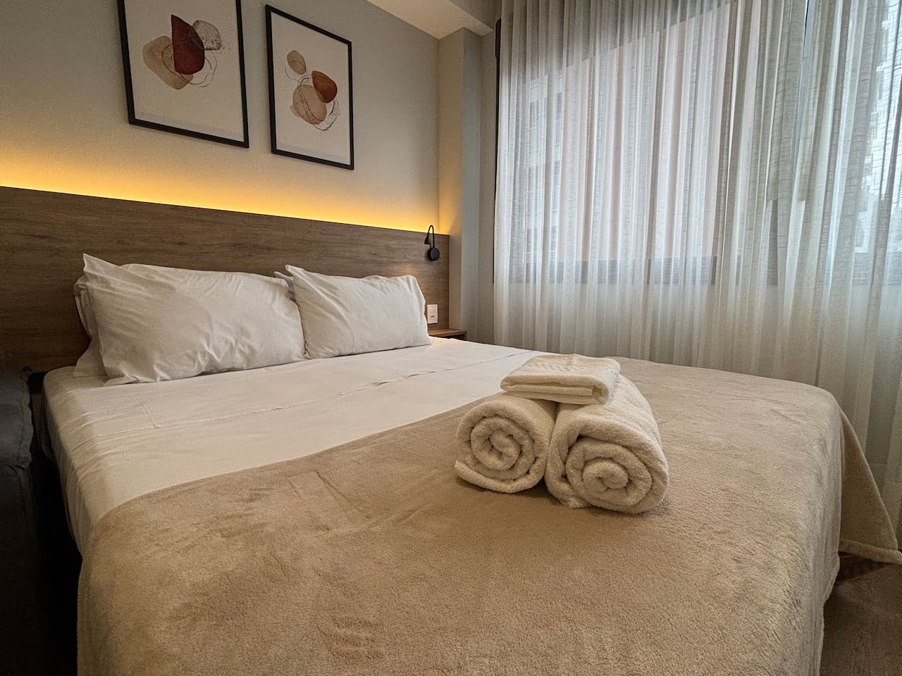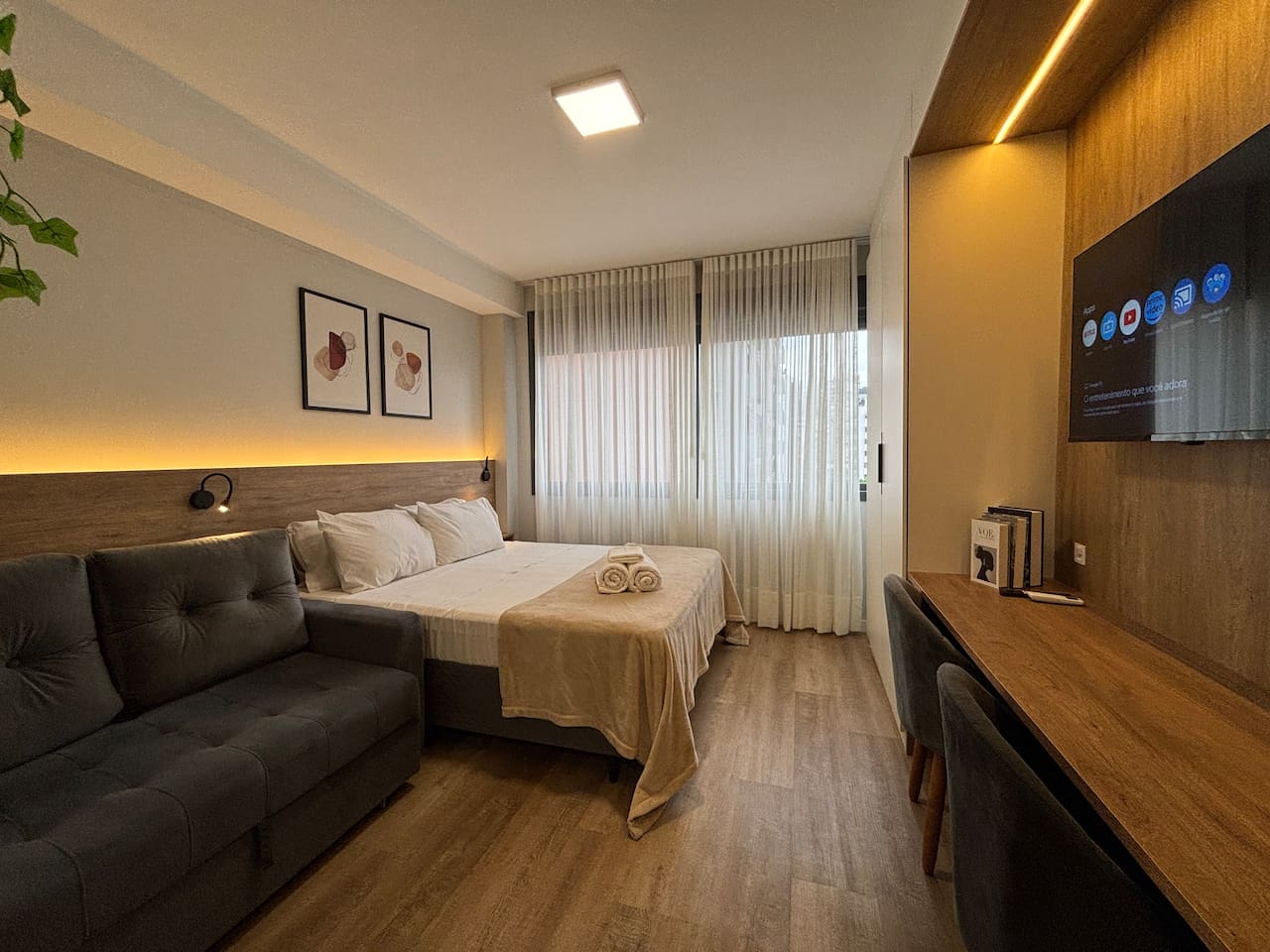 Você terá acesso a uma estrutura de lazer e trabalho que vai além das expectativas 😍✨ 🛟 Piscina panorâmica com toda a infraestrutura para relaxar e apreciar uma vista de tirar o fôlego . 🔥 Rooftop com lareira ecológica e uma vista espetacular da cidade — perfeito para momentos inesquecíveis, de dia ou à noite. 🏋️♂️ Academia moderna e completa, para você manter sua rotina de treinos mesmo fora de casa. 💻 Coworking com ambiente inspirador, ideal para quem precisa trabalhar remotamente com foco e produtividade. 🚗 Estacionamento rotativo incluso na diária, trazendo mais praticidade e conforto à sua estadia. 🧺 Lavanderia 24h self-service (paga), para sua conveniência durante estadias mais longas. 📇 o check-in poderá ser realizado em qualquer horário após as 15h pois possuímos portaria 24h.
