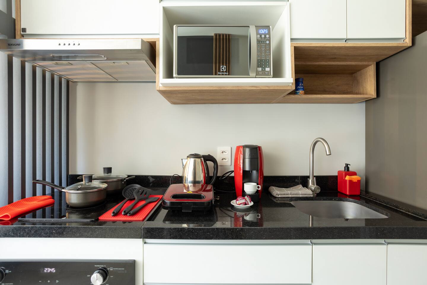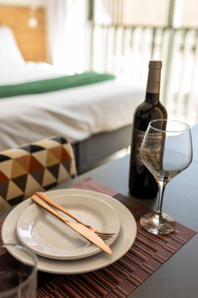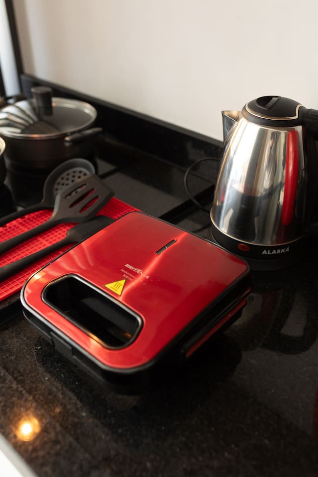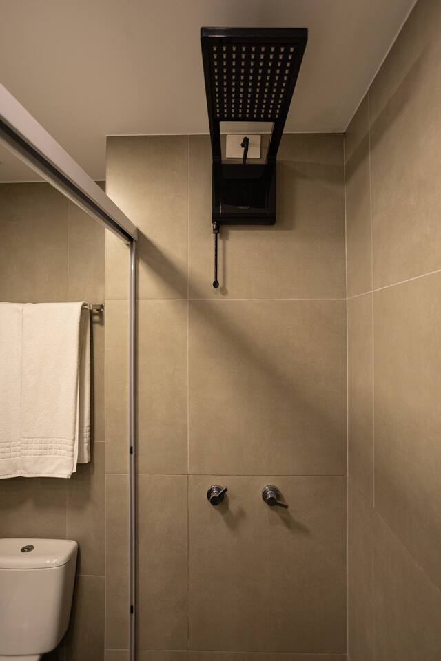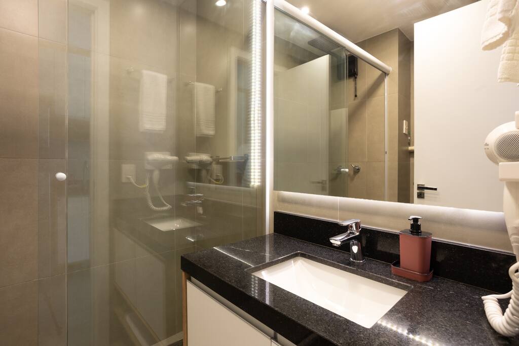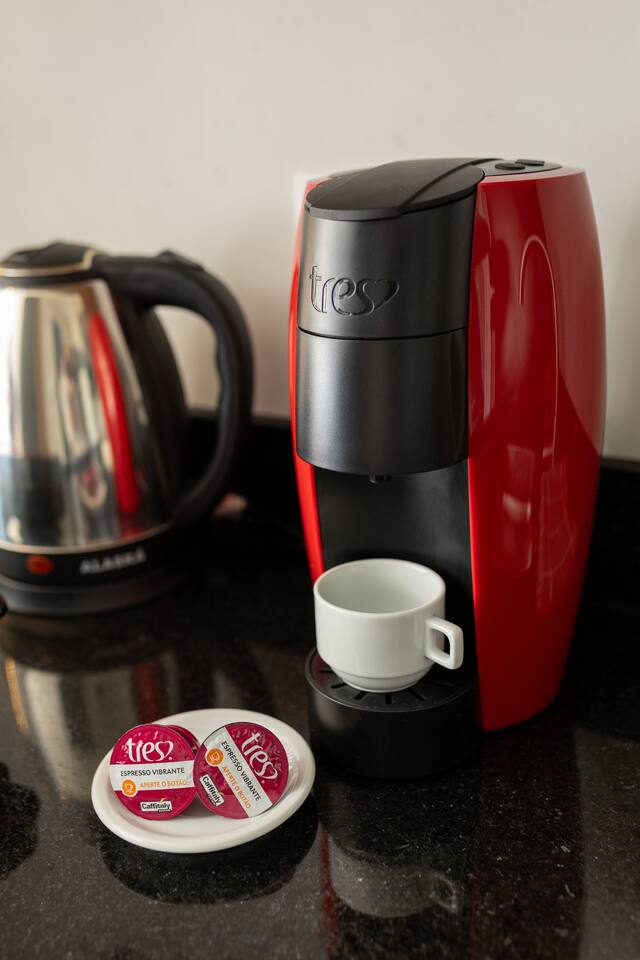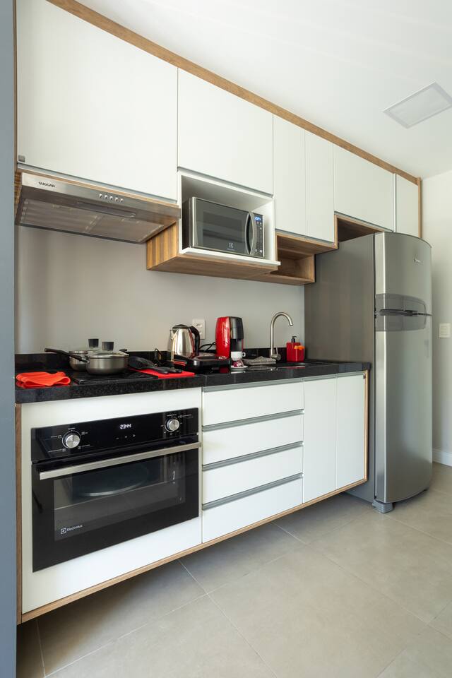Banheiro Chuveiro quente e excelente, banheiro com sabonete para mãos, secador de cabelor e toalhas limpas. Quarto Confortável ao lado com armário, 2 travesseiros + extras, edredom pro frio, SmartTV, 2 cadeiras para sentar, luzes de LED para leitura, mesas de cabeceira, cama QUEEN. WiFi 500mb Cozinha Panelas, taças, fogão indução, tábua de corte, cafeteira de cápsula 3 corações, geladeira com freezer, lixeiras, produtos de limpeza, pratos, chaleira elétrica, utensílios para cozinhar.