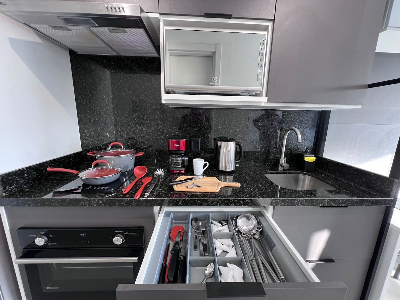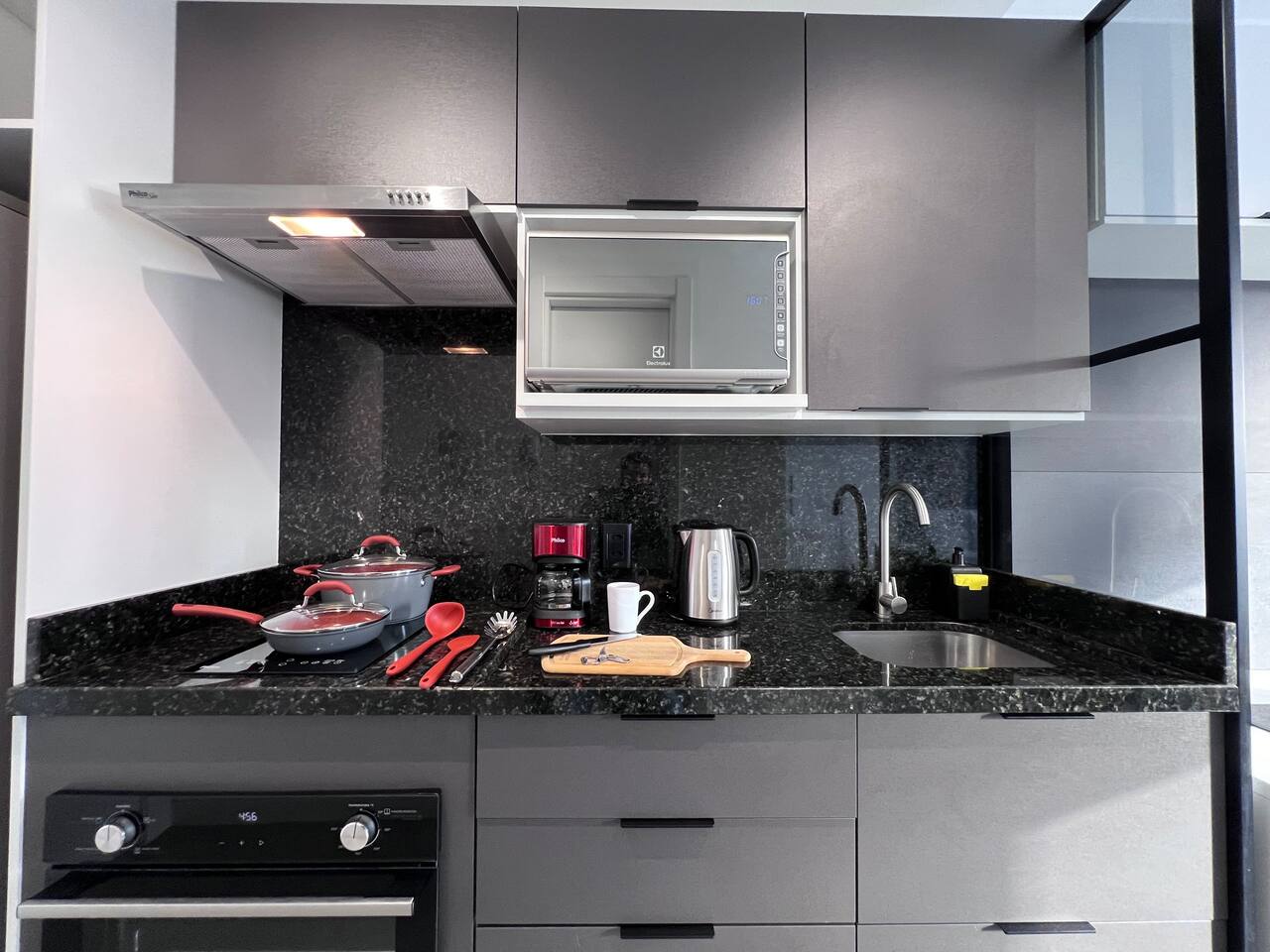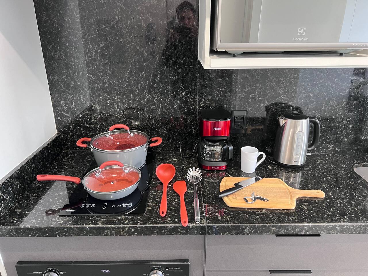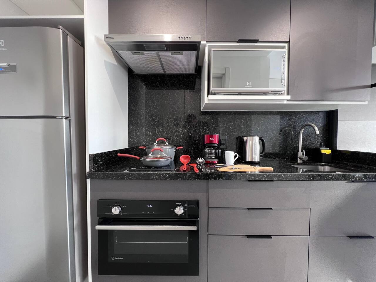 Apto com SmartTV+ (Netflix, Amazon, Disney+, Youtube), Cama Aconchegante, WiFi, Espelho Corpo Inteiro, Ar-Condicionado. · Cozinha Completa, Microondas, Fogão Indução, Chá e Café Cortesia, Geladeira, Panelas de Indução, Pratos e Talheres de qualidade. Banheiro com chuveiro quente, 12º andar, com elevador e self check-in :) · Estacionamento gratuito, Portaria 24h, Lavanderia 24h, Terraço com Churrasqueiras 24h, Espaço Aconchegante de Cowork 24h, Espaço Fitness, Elevadores, Piscina!