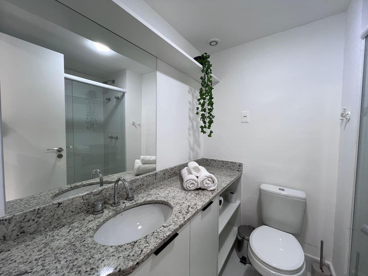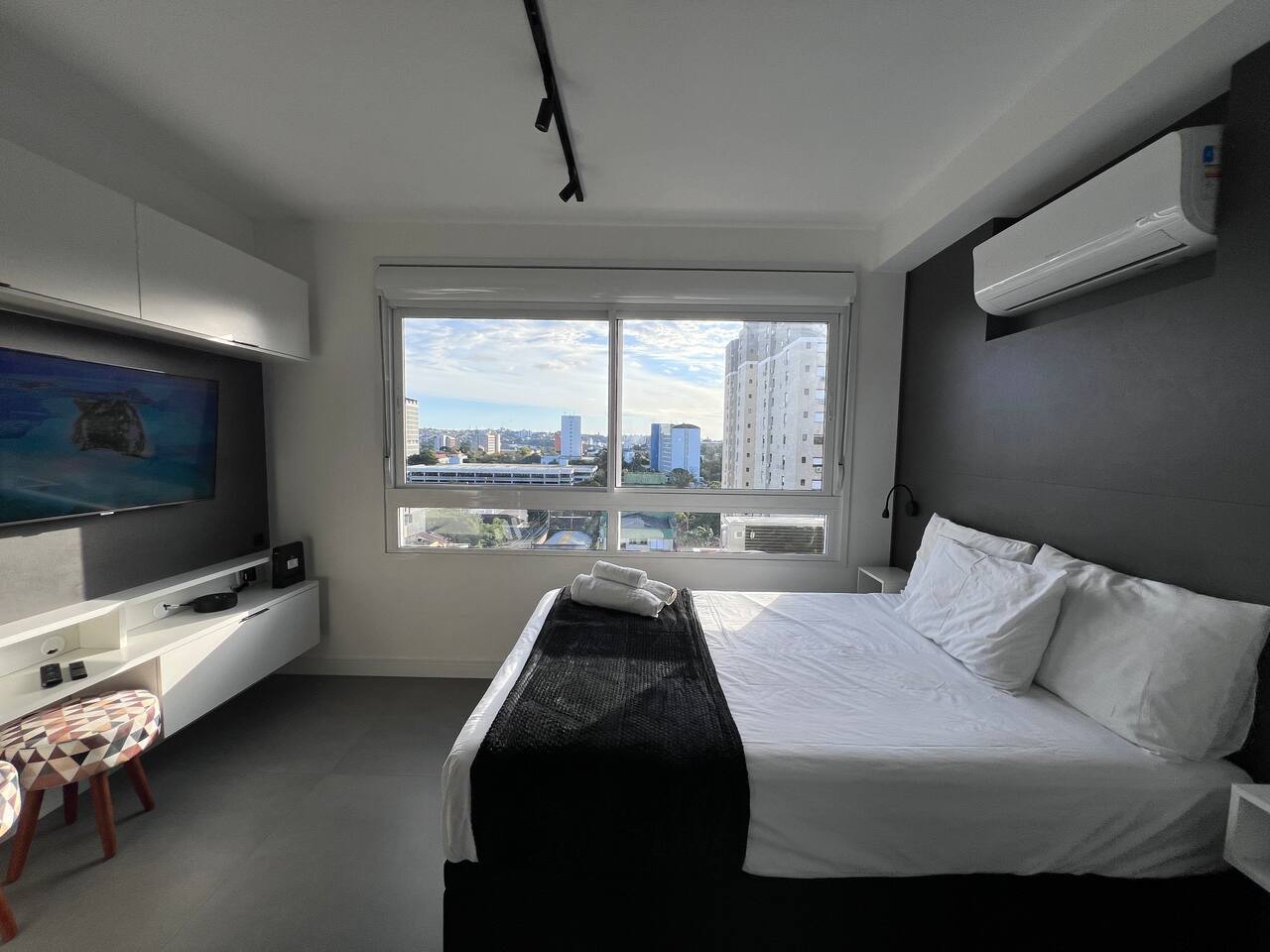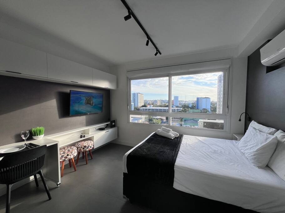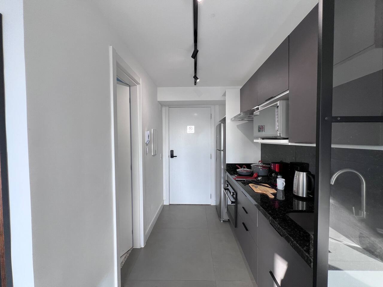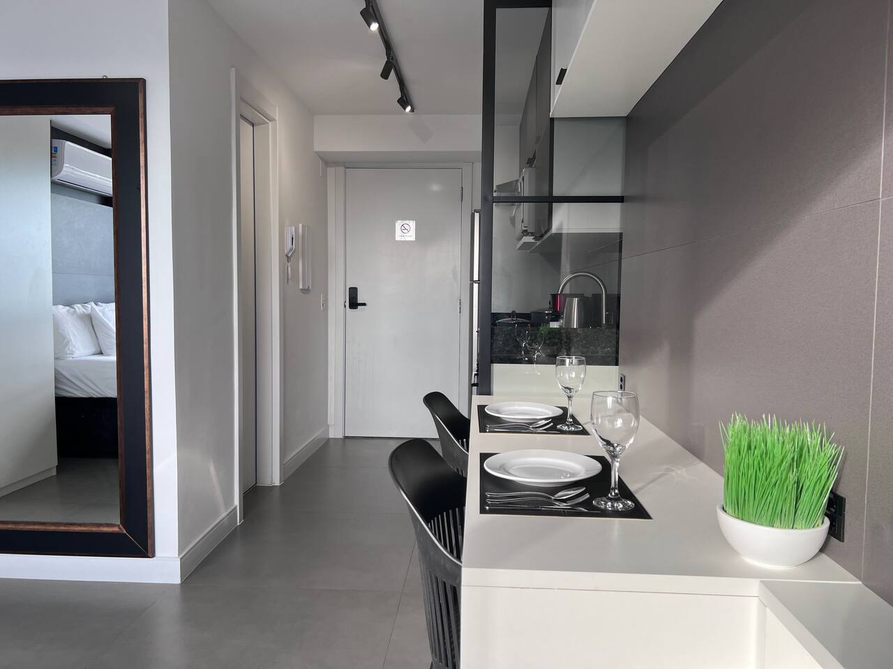 Apto com SmartTV+ (Netflix, Amazon, Disney+, Youtube), Cama Aconchegante, WiFi, Espelho Corpo Inteiro, Ar-Condicionado. · Cozinha Completa, Microondas, Fogão Indução, Chá e Café Cortesia, Geladeira, Panelas de Indução, Pratos e Talheres de qualidade. Banheiro com chuveiro quente, 12º andar, com elevador e self check-in :) · Estacionamento gratuito, Portaria 24h, Lavanderia 24h, Terraço com Churrasqueiras 24h, Espaço Aconchegante de Cowork 24h, Espaço Fitness, Elevadores, Piscina!