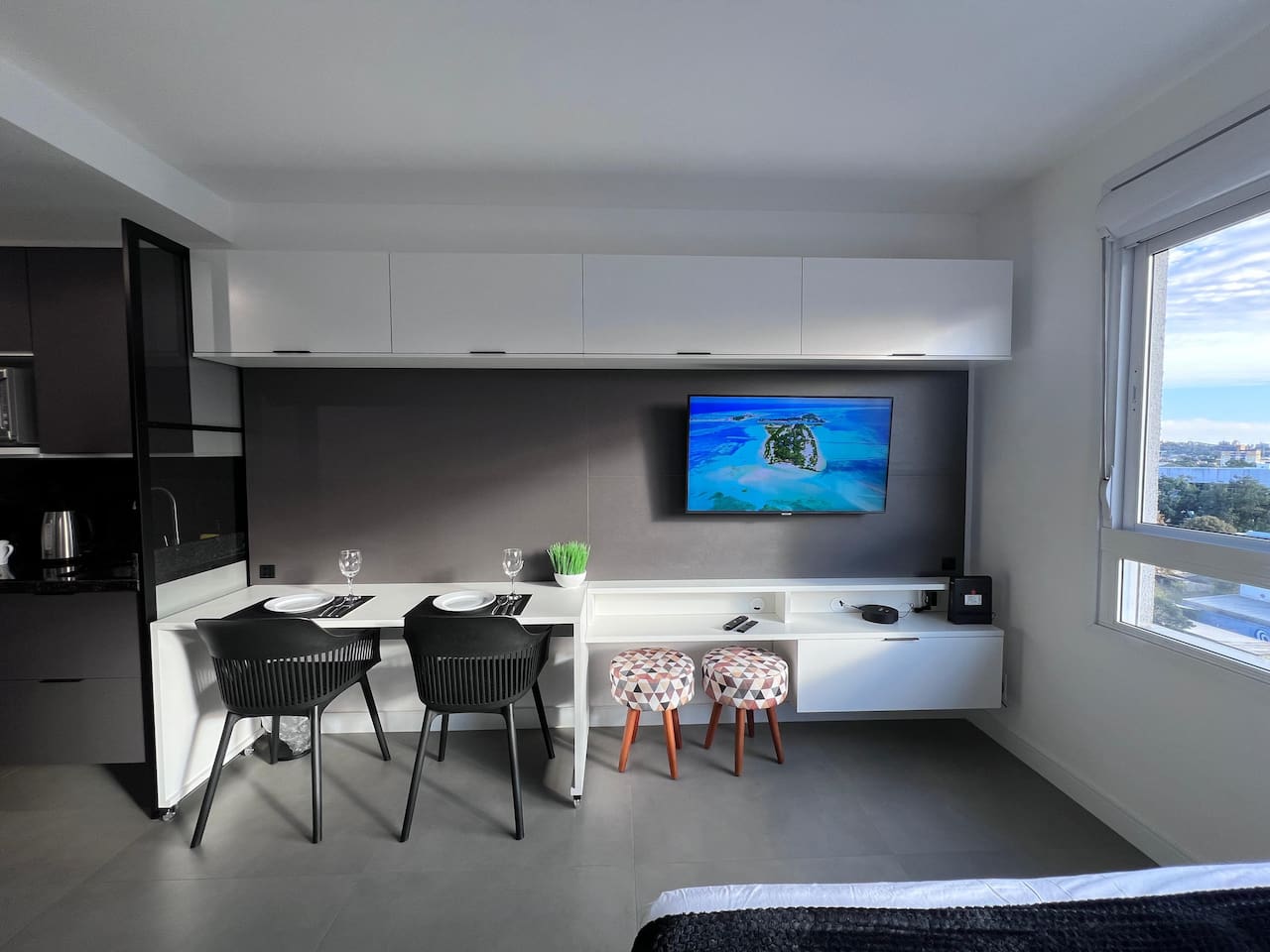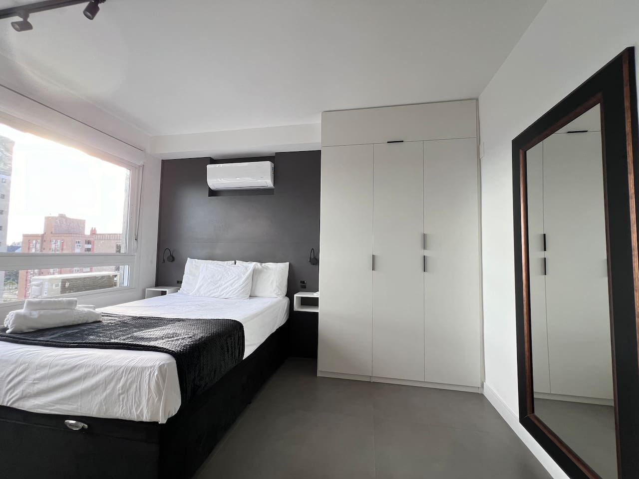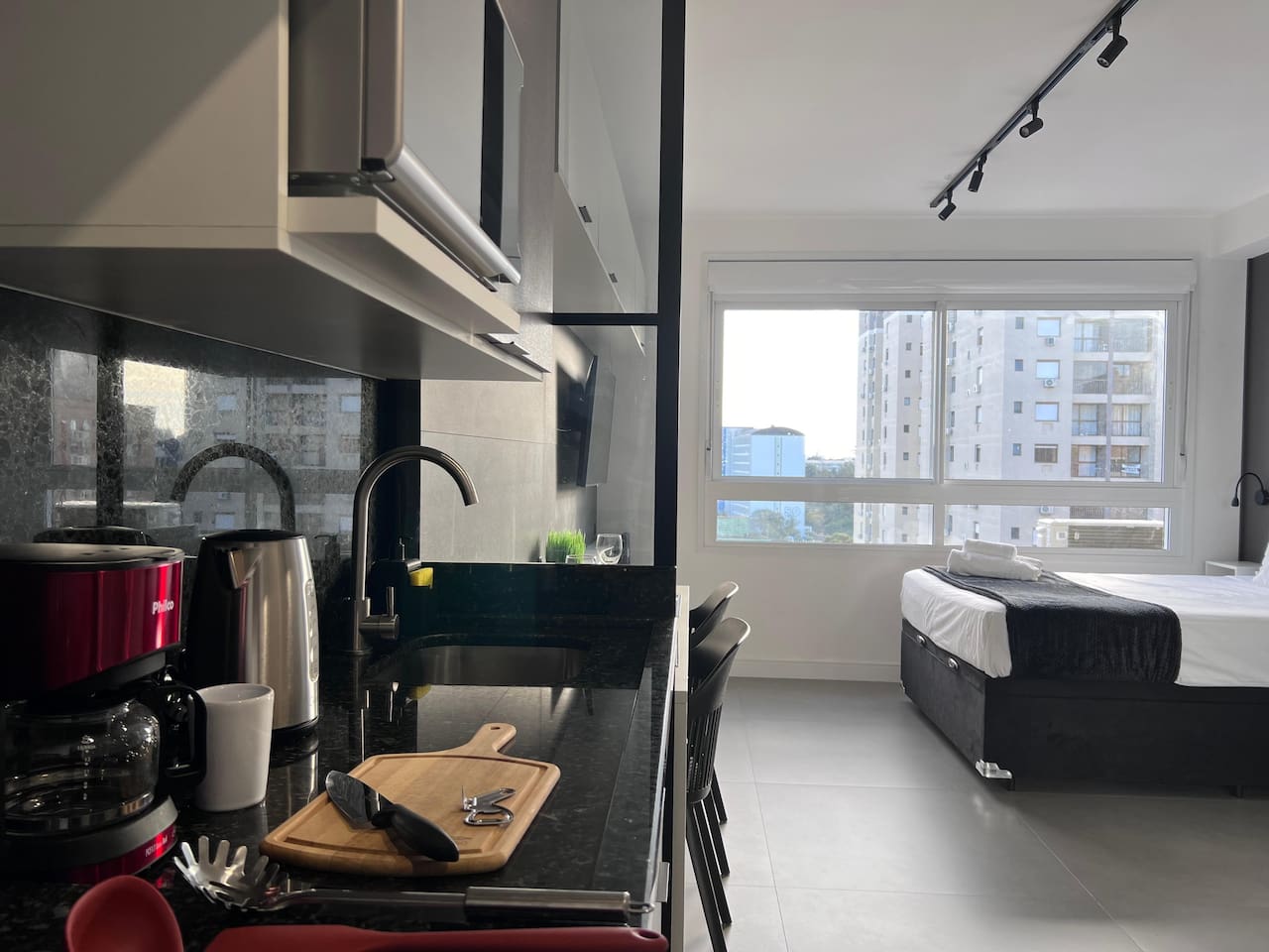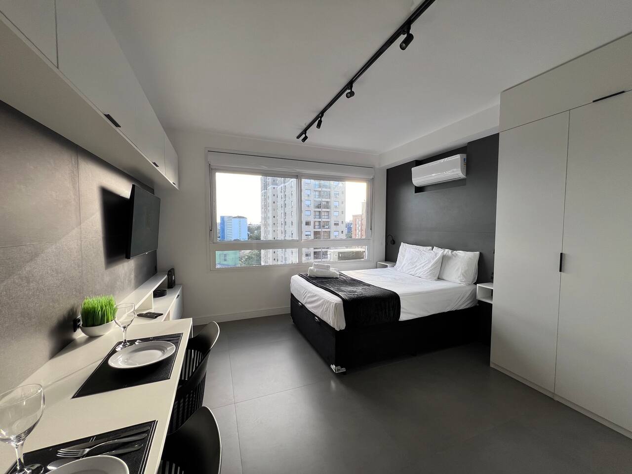 Apto com SmartTV+ (Netflix, Amazon, Disney+, Youtube), Cama Aconchegante, WiFi, Espelho Corpo Inteiro, Ar-Condicionado. · Cozinha Completa, Microondas, Fogão Indução, Chá e Café Cortesia, Geladeira, Panelas de Indução, Pratos e Talheres de qualidade. Banheiro com chuveiro quente, 12º andar, com elevador e self check-in :) · Estacionamento gratuito, Portaria 24h, Lavanderia 24h, Terraço com Churrasqueiras 24h, Espaço Aconchegante de Cowork 24h, Espaço Fitness, Elevadores, Piscina!