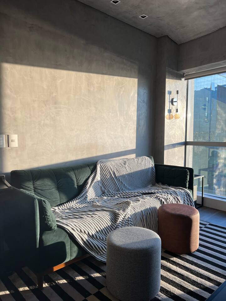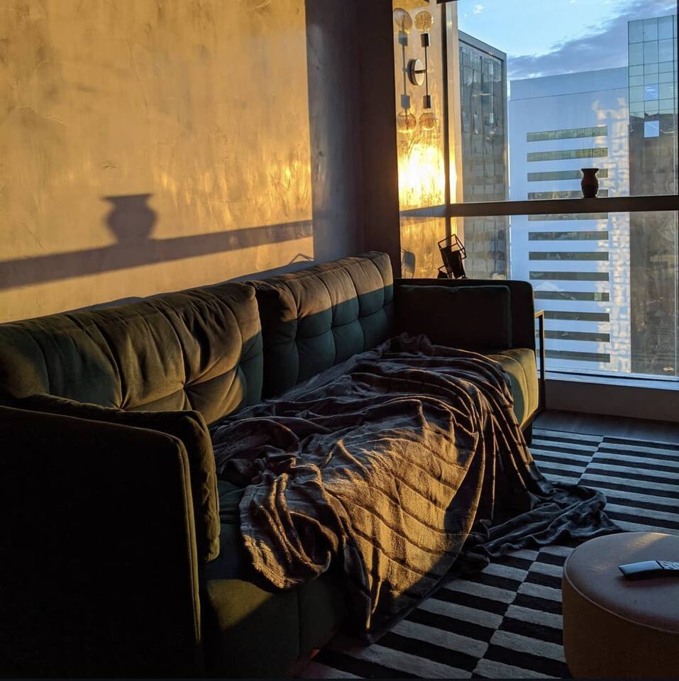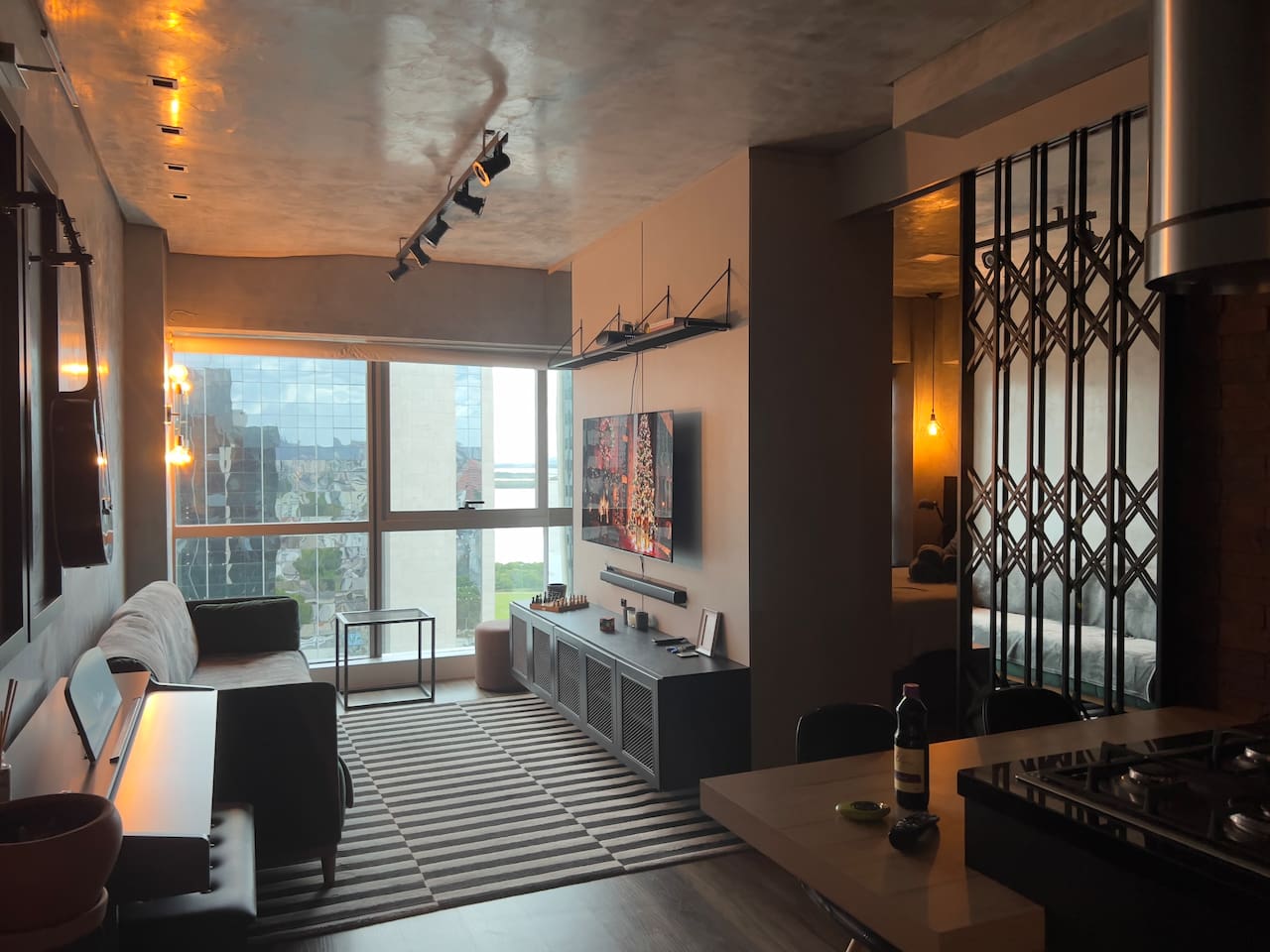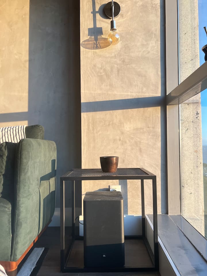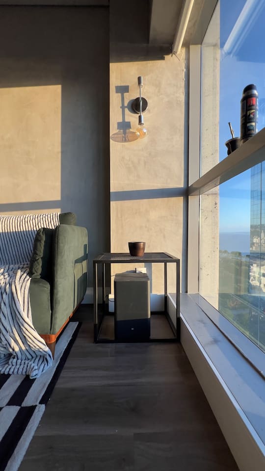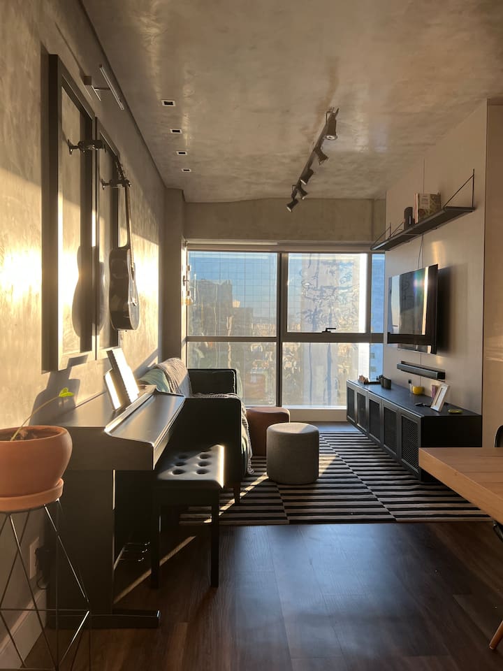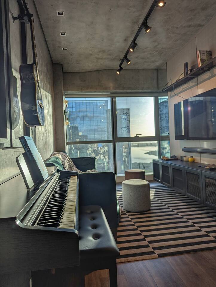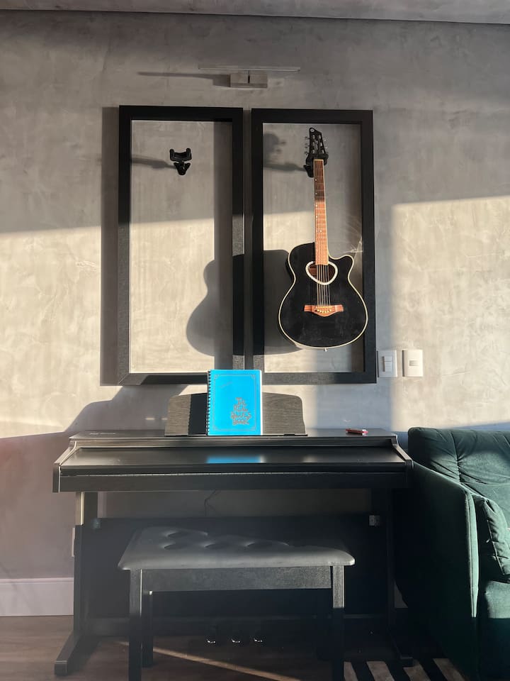 🛏️1 quarto separado da sala com cama box e blackouts 🛁 Banheiro moderno com acabamentos de alto padrão e ducha potente 🛋️ Sala de estar com sofá aconchegante, TV OLED Smart e iluminação natural incrível 🍳 Cozinha completa com eletros gourmet para quem ama cozinhar 🌅 Vista deslumbrante do pôr do sol (de Maio à Agosto) 📶 Wi-Fi rápido e mesa de trabalho para quem precisa produzir 🎵 Ambiente decorado com instrumentos musicais e toques artísticos