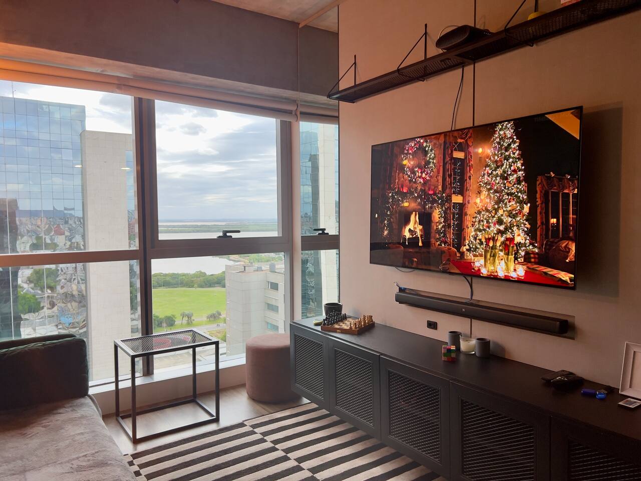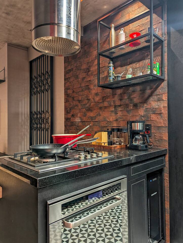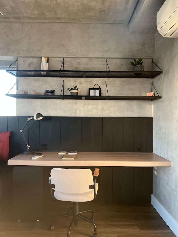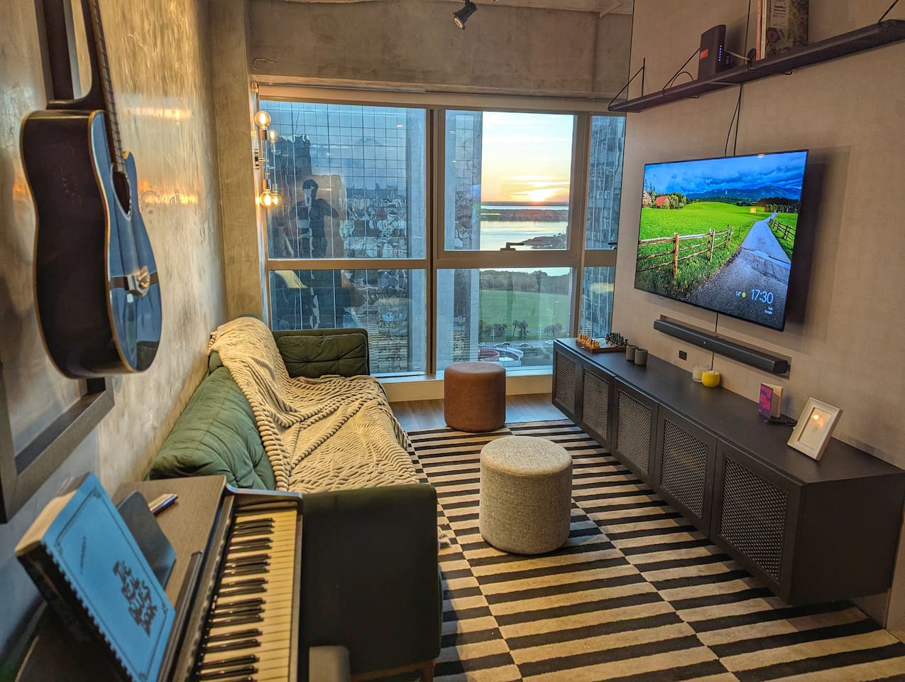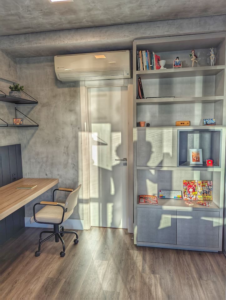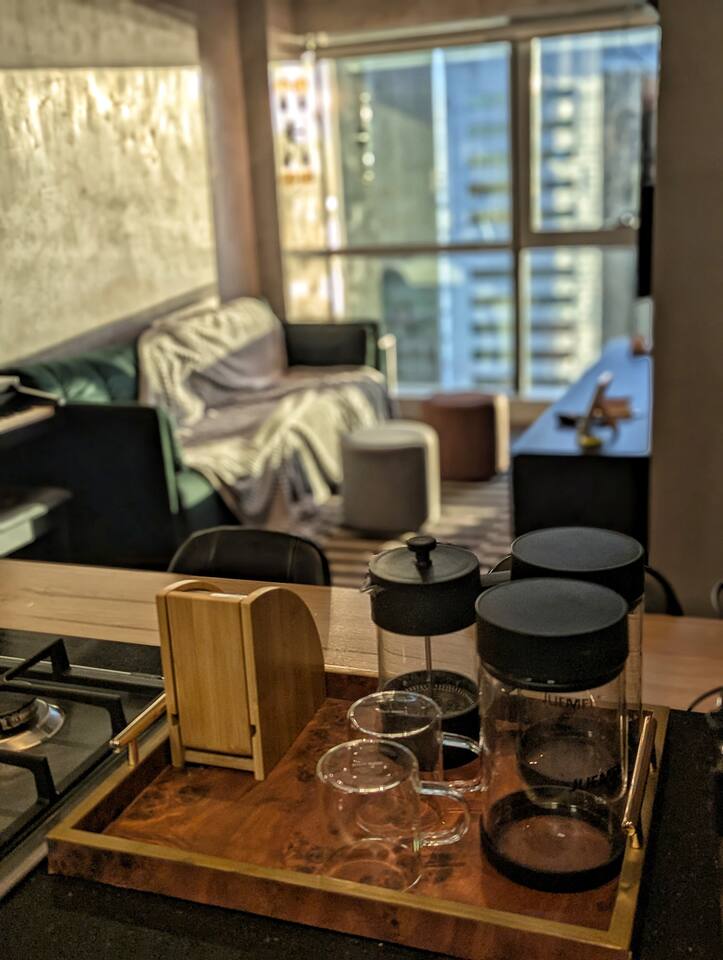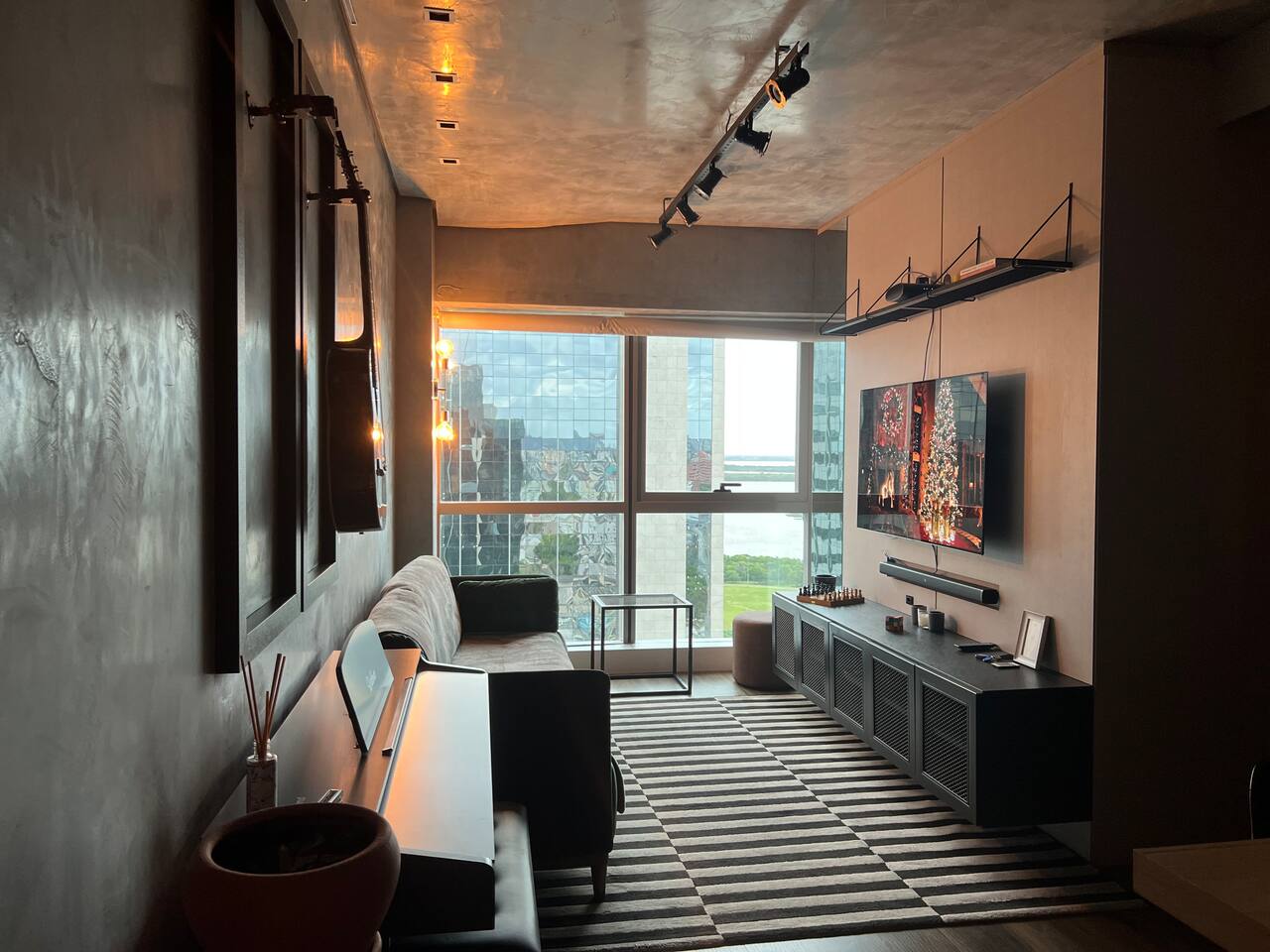 🛏️1 quarto separado da sala com cama box e blackouts 🛁 Banheiro moderno com acabamentos de alto padrão e ducha potente 🛋️ Sala de estar com sofá aconchegante, TV OLED Smart e iluminação natural incrível 🍳 Cozinha completa com eletros gourmet para quem ama cozinhar 🌅 Vista deslumbrante do pôr do sol (de Maio à Agosto) 📶 Wi-Fi rápido e mesa de trabalho para quem precisa produzir 🎵 Ambiente decorado com instrumentos musicais e toques artísticos