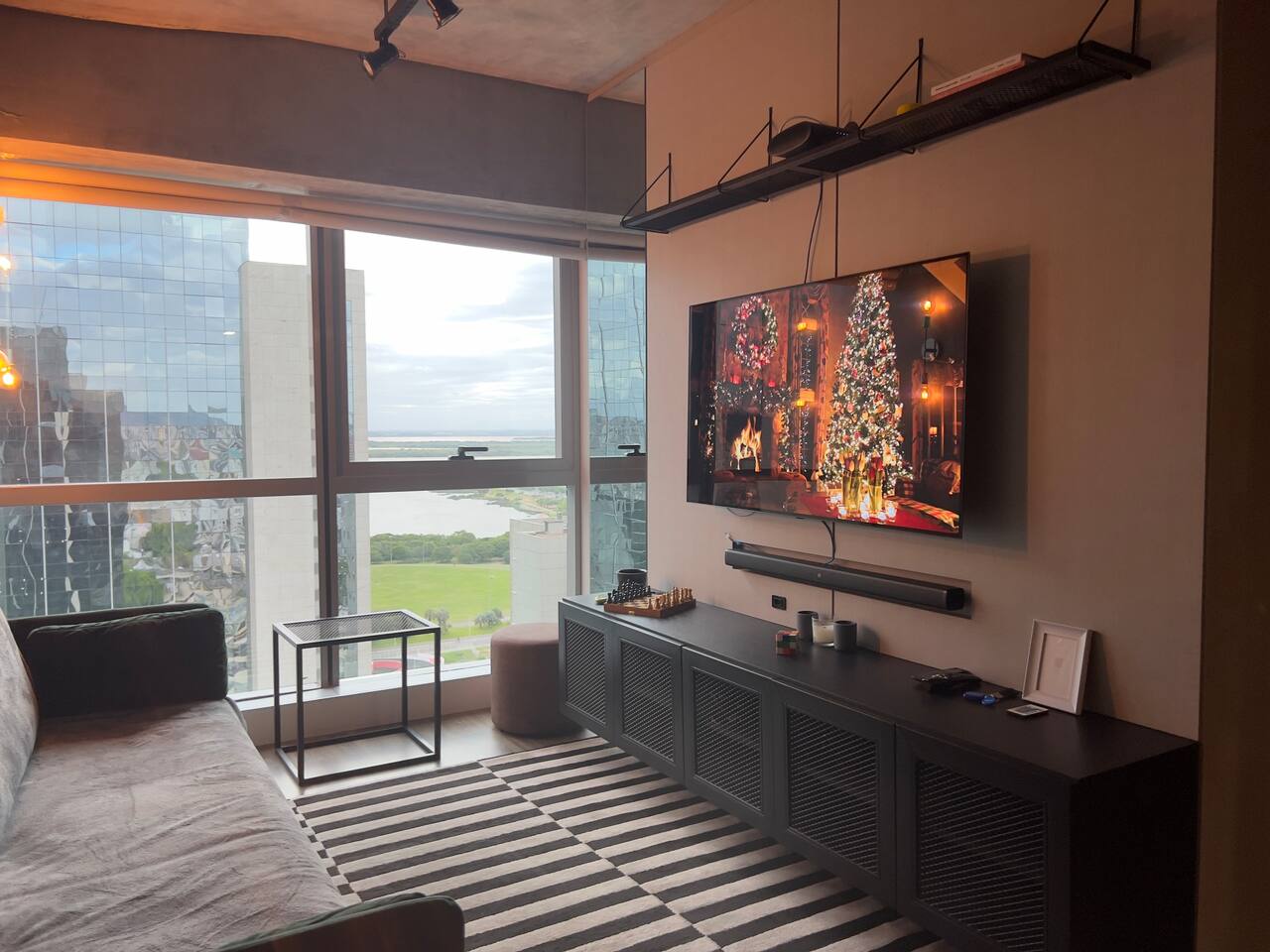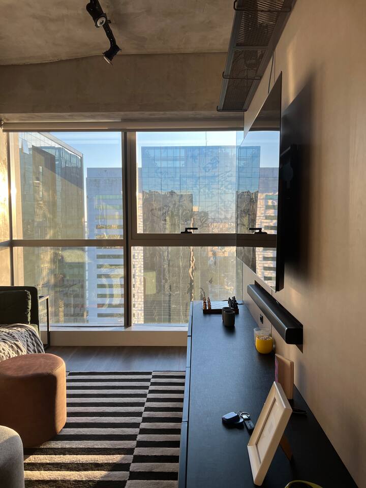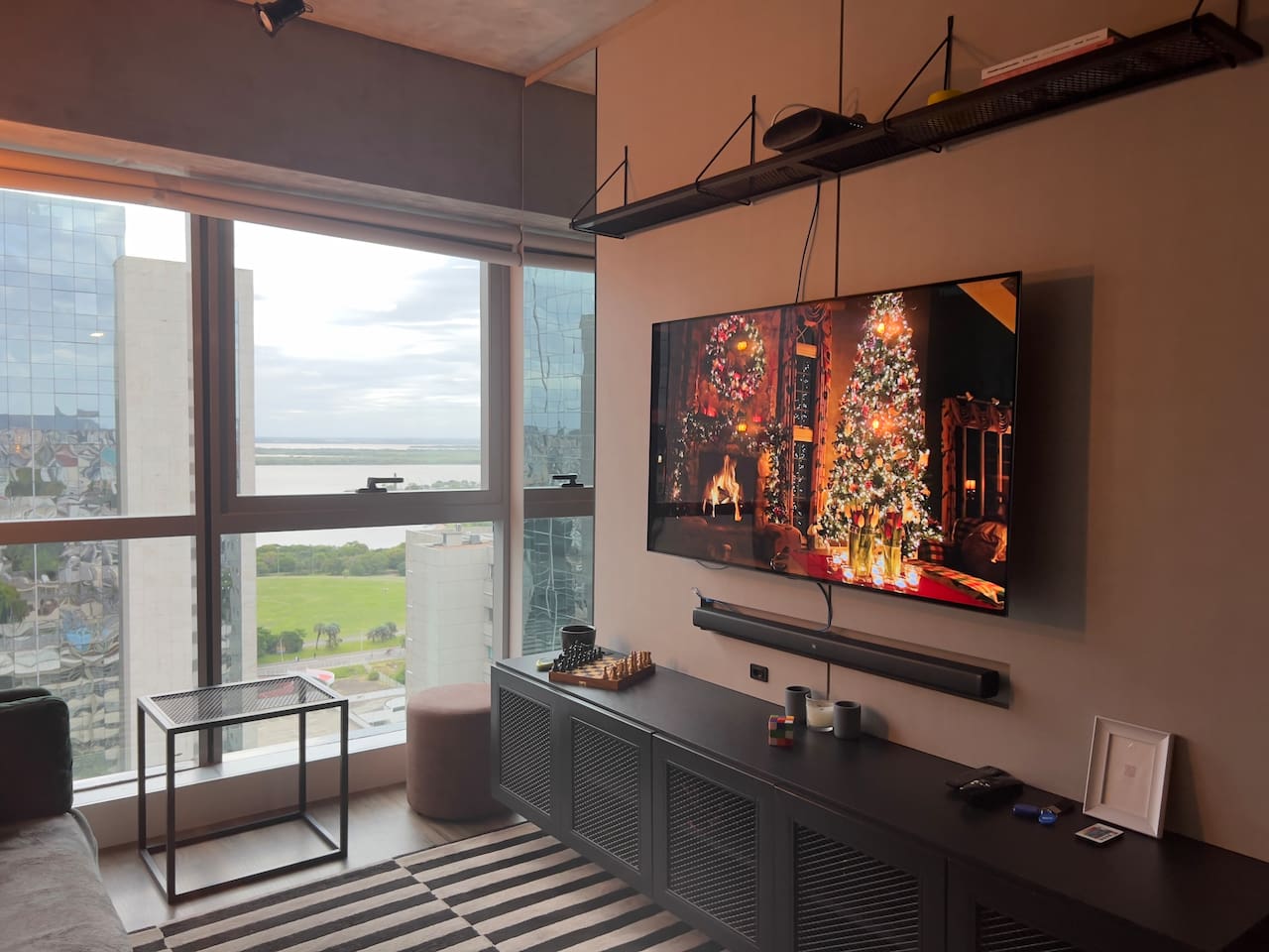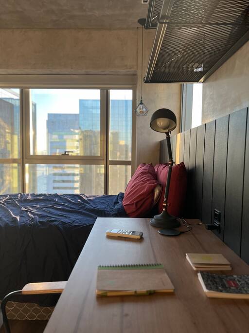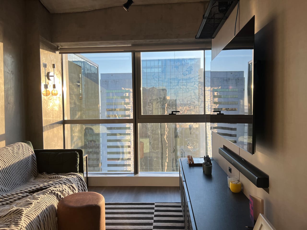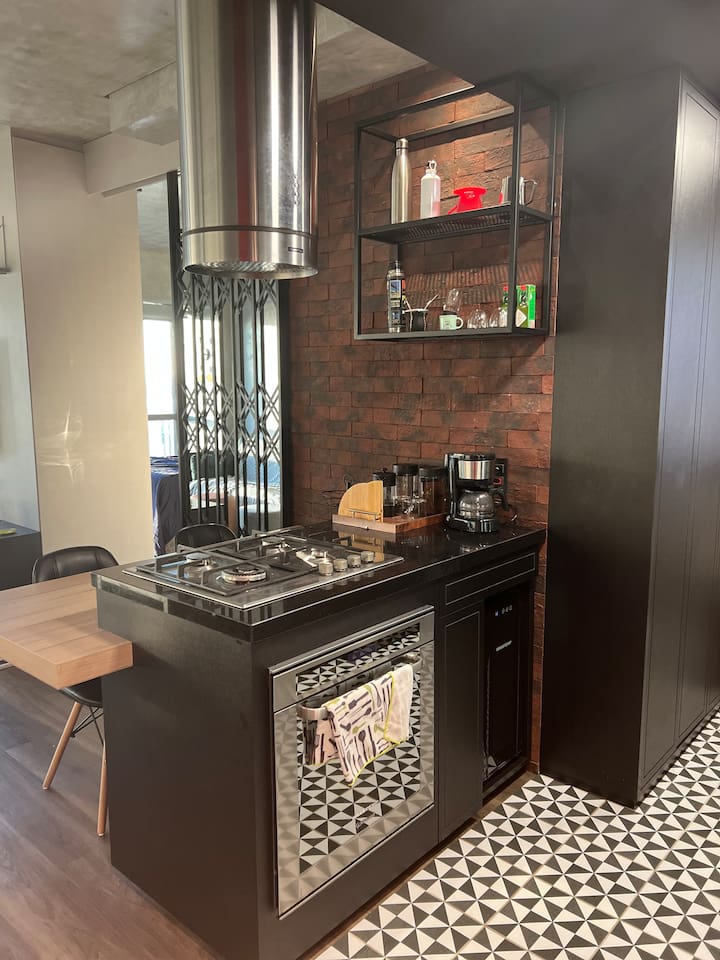 🛏️1 quarto separado da sala com cama box e blackouts 🛁 Banheiro moderno com acabamentos de alto padrão e ducha potente 🛋️ Sala de estar com sofá aconchegante, TV OLED Smart e iluminação natural incrível 🍳 Cozinha completa com eletros gourmet para quem ama cozinhar 🌅 Vista deslumbrante do pôr do sol (de Maio à Agosto) 📶 Wi-Fi rápido e mesa de trabalho para quem precisa produzir 🎵 Ambiente decorado com instrumentos musicais e toques artísticos